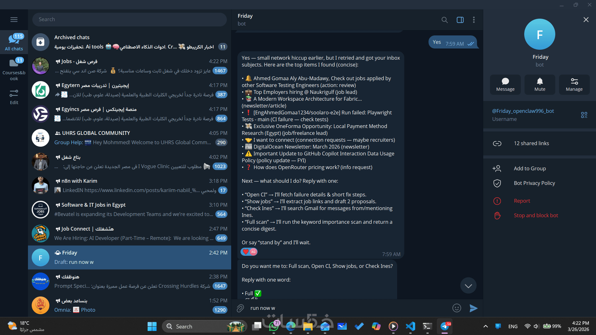 - ربطه بأدوات الأتمتة (Telegram / APIs / Tasks)