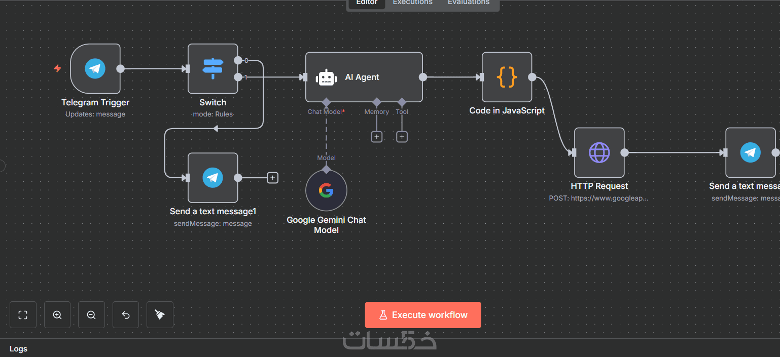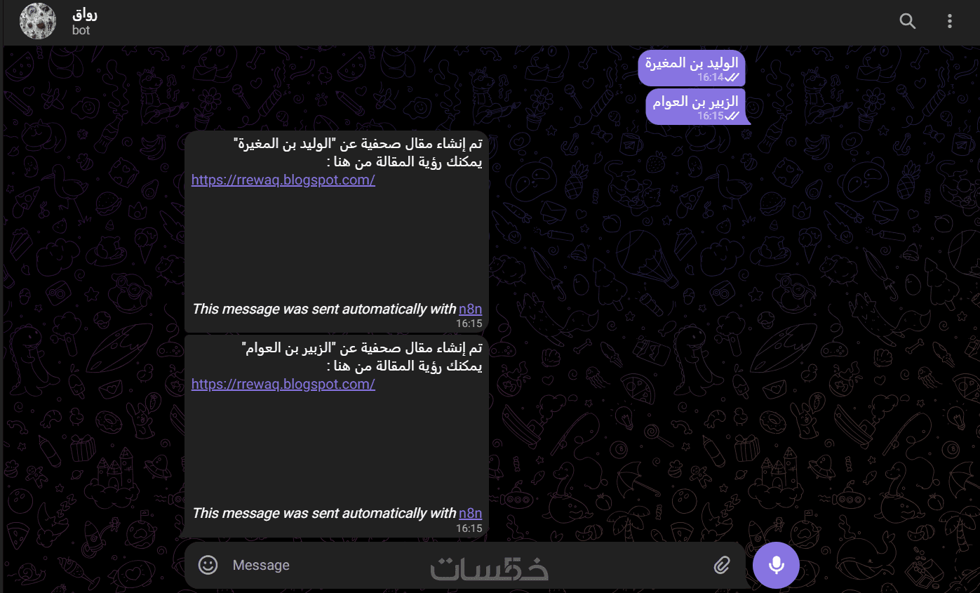 يستقبل البوت موضوعًا من المستخدم ، فيقوم البوت بإنشاء مقال كامل مع كلمات مفتاحية بعد تمريره الي موديل AI ، ثم ينسقه عبر كود مخصص، وينشره مباشرة في المدونة عبر API، ويرد البوت على المستخدم برابط المقال , ويتم ربط البوت بأستخدام API مع باقي Automation