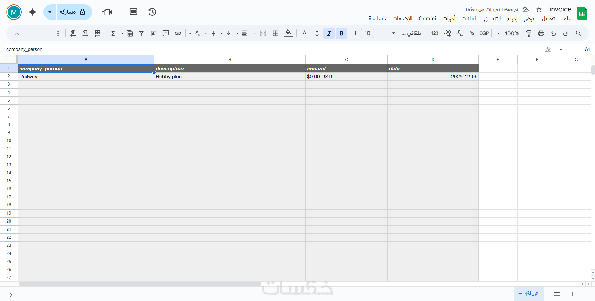 تصميم وربط جدول البيانات بالأعمدة الأساسية اللازمة (التاريخ، الوصف، المبلغ، التصنيف,او اي حاجه انت عايزها) ليكون جاهزاً لاستقبال الداتا.