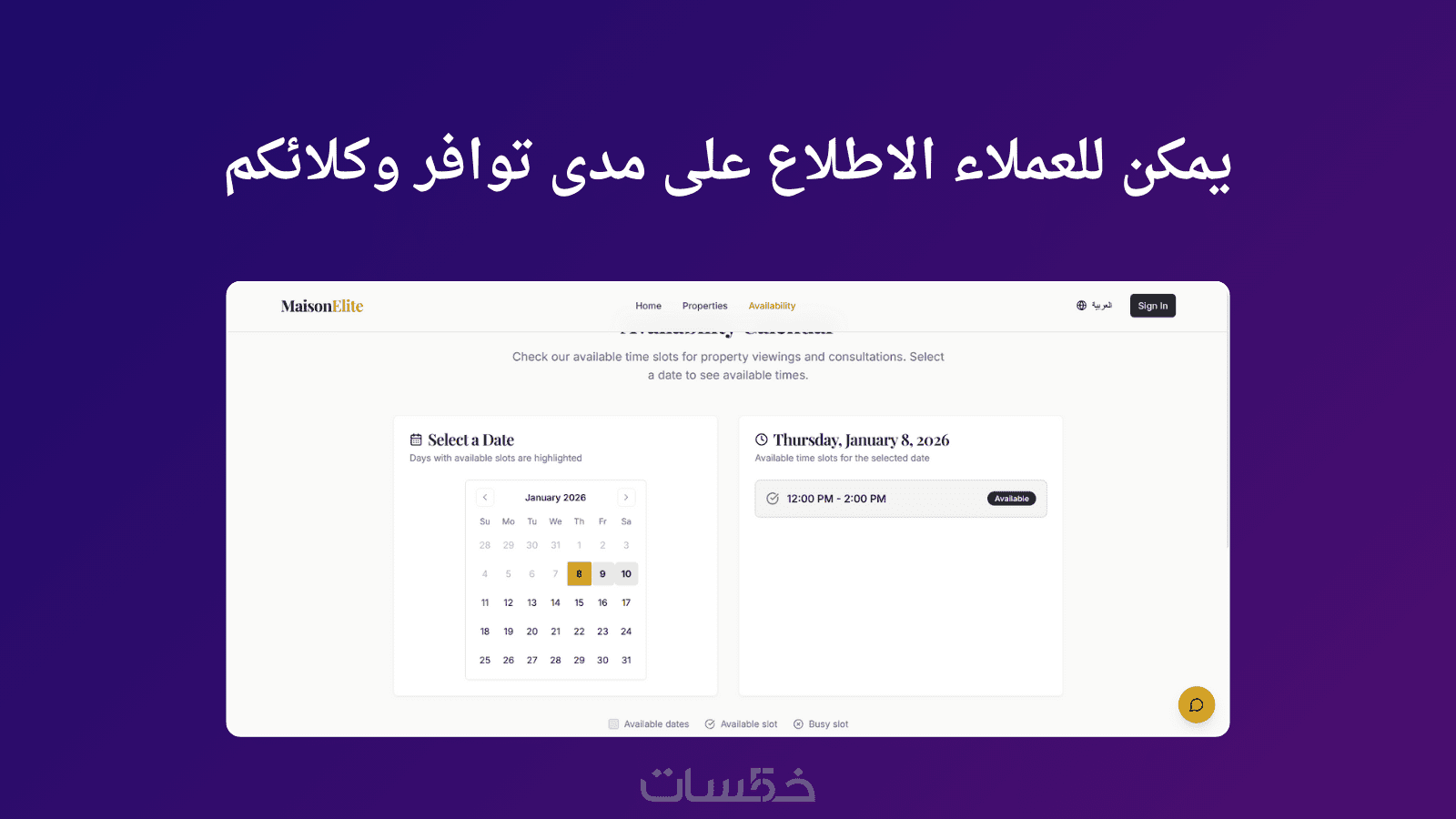 ثلاث صفحات ( الصفحة الرئيسية ، صفحة العقارات ، صفحة الإطلاع على توافر العملاء)