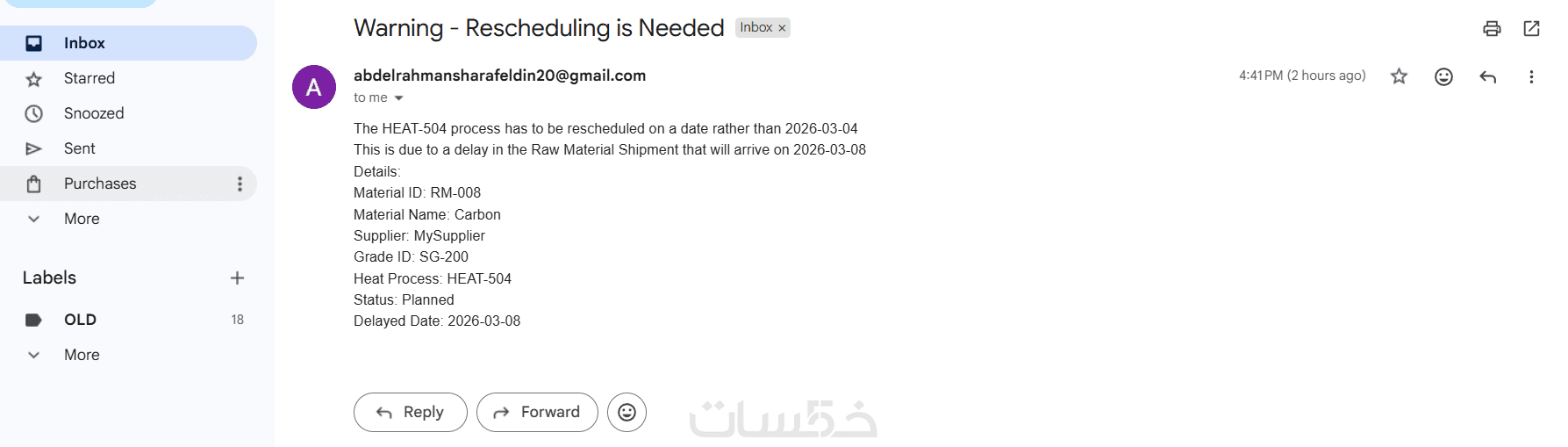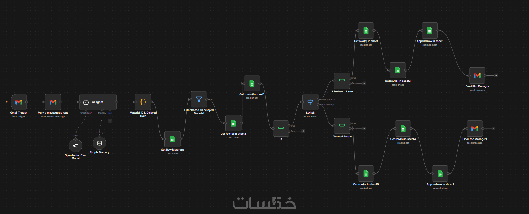 أتمتة استخراج رقم المادة الخام من إيميلات الموردين المتأخرة، تحديد خط الإنتاج المتضرر، وإرسال تنبيه فوري للإدارة لتفادي الخسائر.