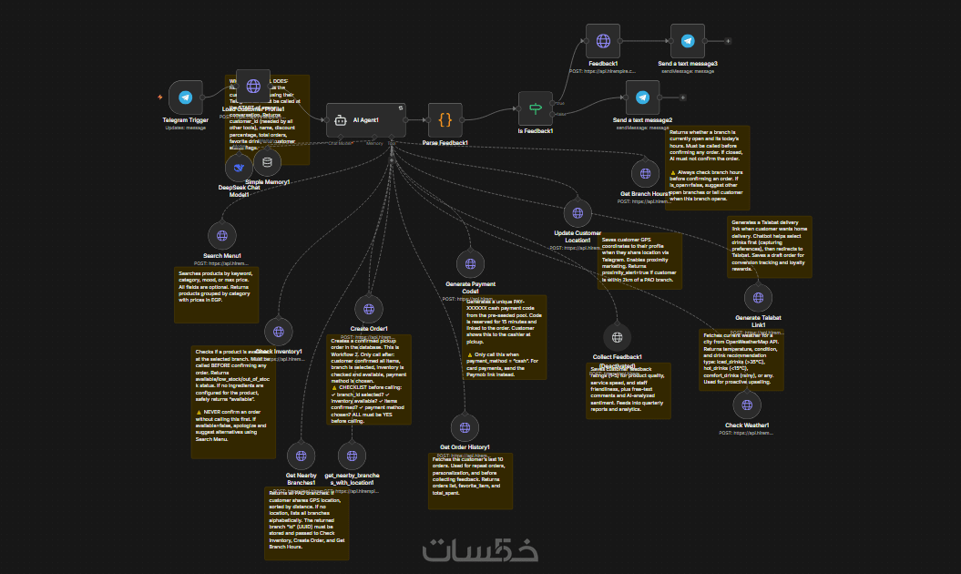 المكونات: قاعدة بيانات Neon PostgreSQL، DeepSeek LLM، Telegram API، وCode Nodes لاتخاذ القرارات.