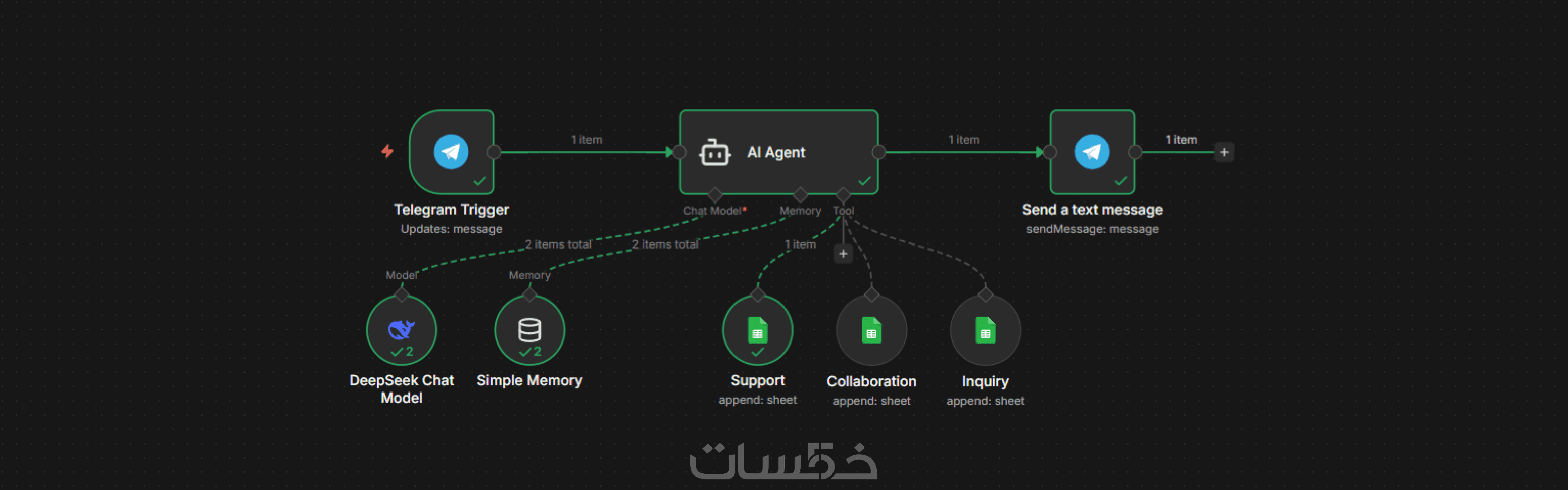 ربط AI Agent مع Telegram باستخدام LLM DeepSeek للرد الفوري على استفسارات العملاء وفهم نيتهم بدقة واحترافية.