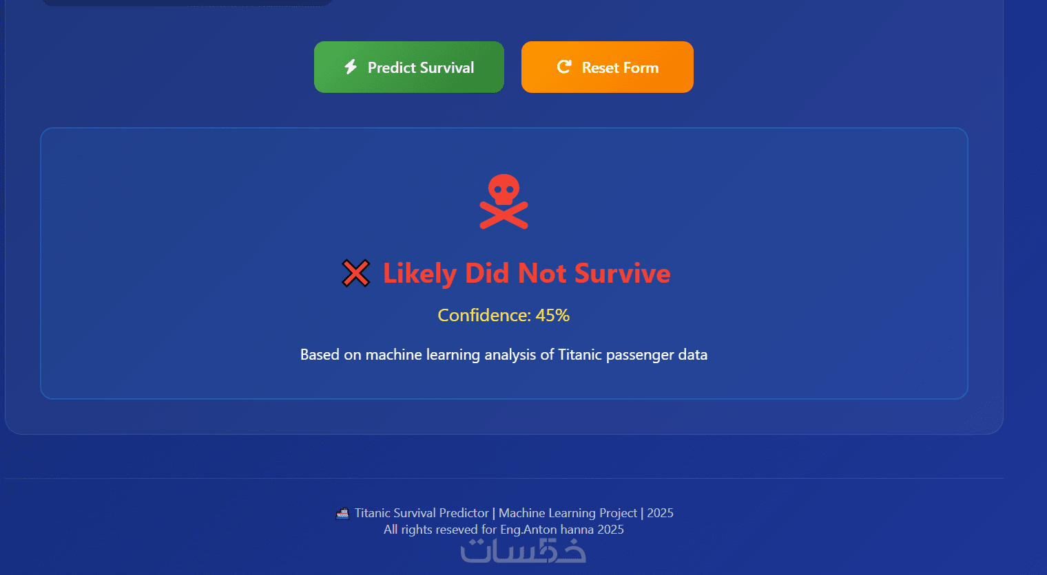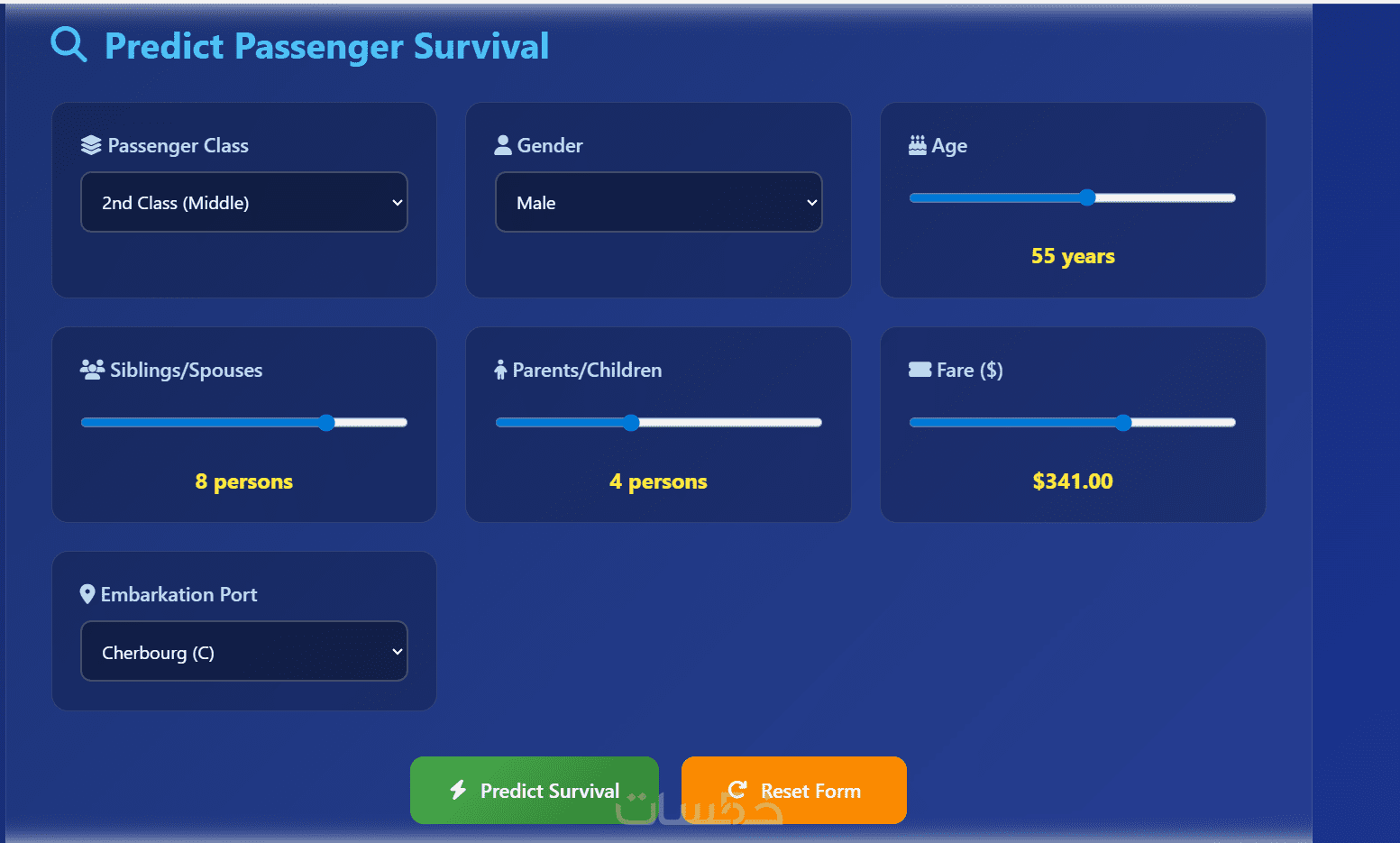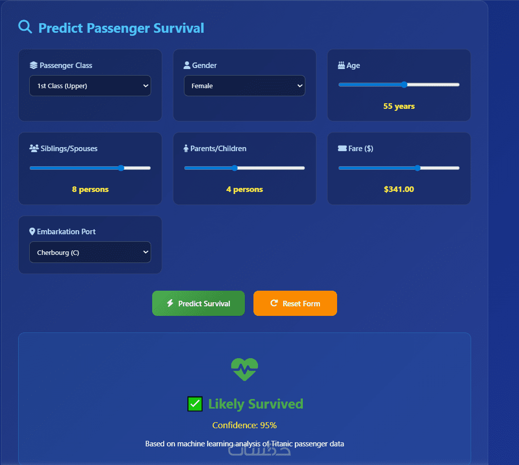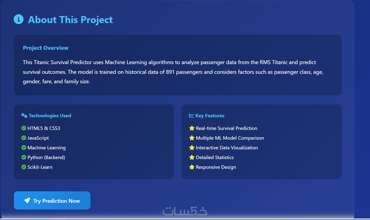 أقدم خدمة تطوير وتصميم موقع ويب تفاعلي متكامل للتنبؤ بفرص نجاة ركاب سفينة تيتانيك باستخدام تقنيات الذكاء الاصطناعي وتحليل البيانات المتقدمة. يتيح الموقع للمستخدمين إدخال بيانات الركاب (الفئة، الجنس، العمر، عدد الأقارب، سعر التذكرة) ويقوم بتشغيل عدة خوارزميات تعلم آلة للحصول على تنبؤ دقيق مع نسبة ثقة اعلي .