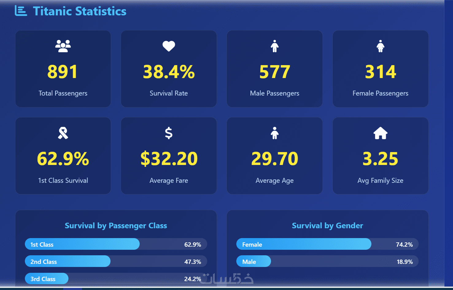 تعرض بيانات شاملة عن الركاب: الإجمالي، نسب النجاة، توزيع الجنسين، متوسط العمر والسعر.