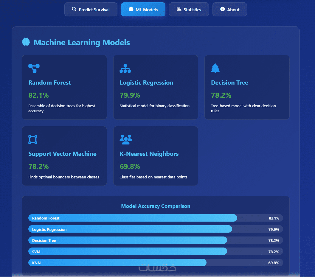 صفحة للتنبوء بالنجاة و صفحة النماذج و المقارنة بينهم و اختيار الافضل من حيث الاعلي في الدقة