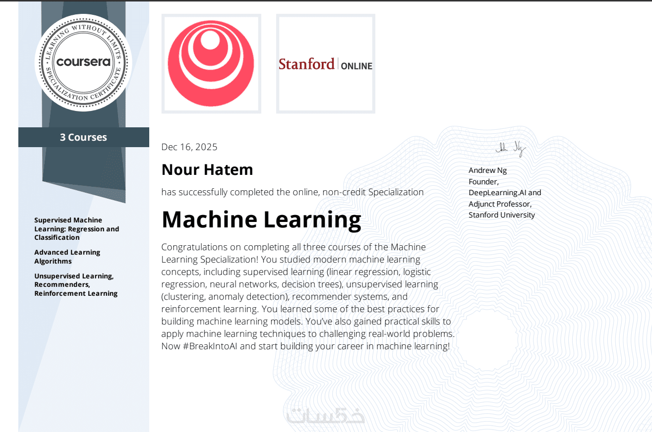 أعمل على مهام الانحدار Regression، التصنيف Classification، التجميع Clustering، وأساليب التعلم غير المشرف Unsupervised Learning. أتعامل مع البيانات الرقمية والنصية فقط، مع تنفيذ كامل للمشروع باستخدام Python.