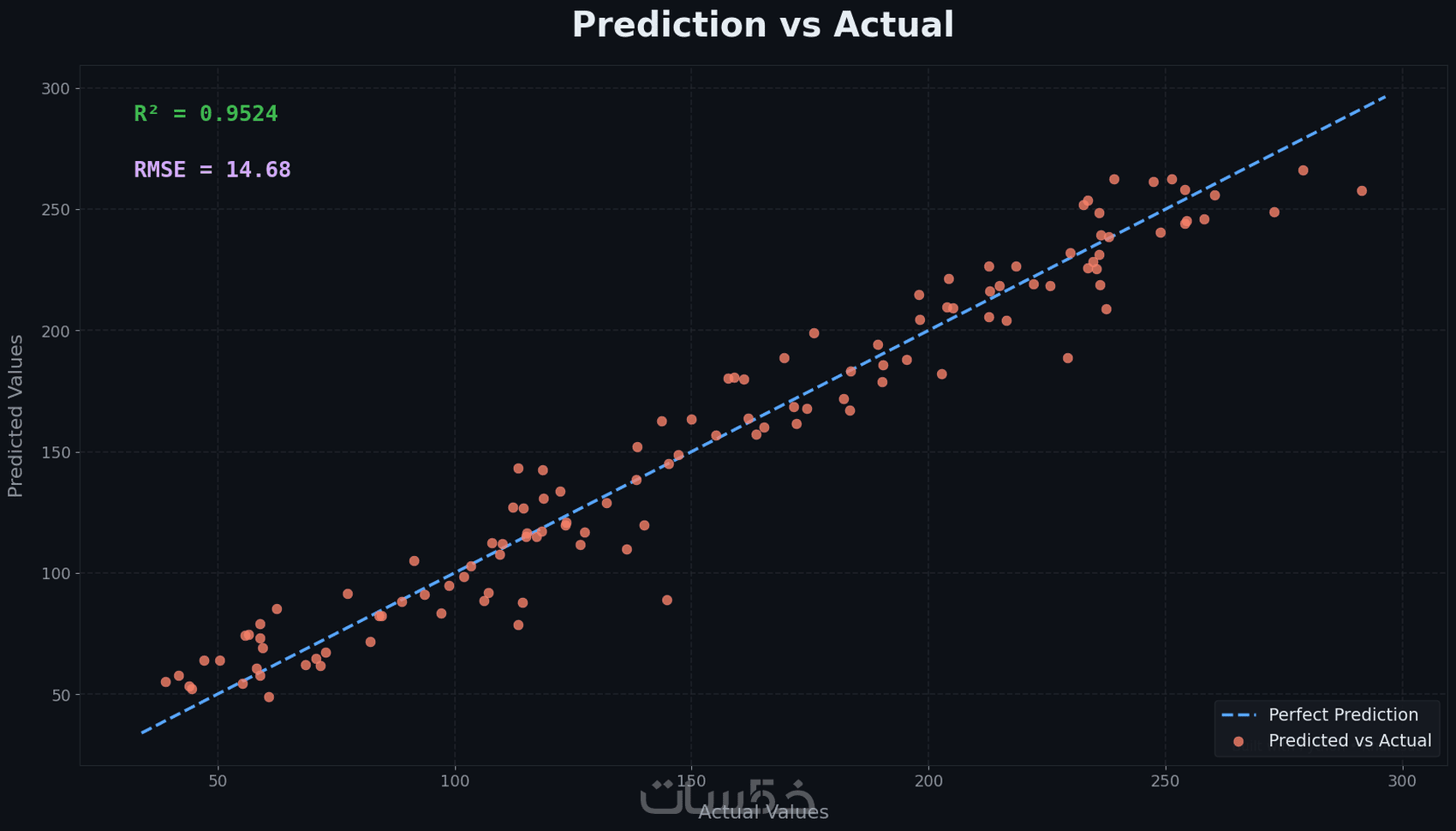 بشرحلك النتائج بالتفصيل زي معامل التحديد، ومتوسط جذر مربع الخطأ، والمعادلة الرياضية بأسلوب بسيط.