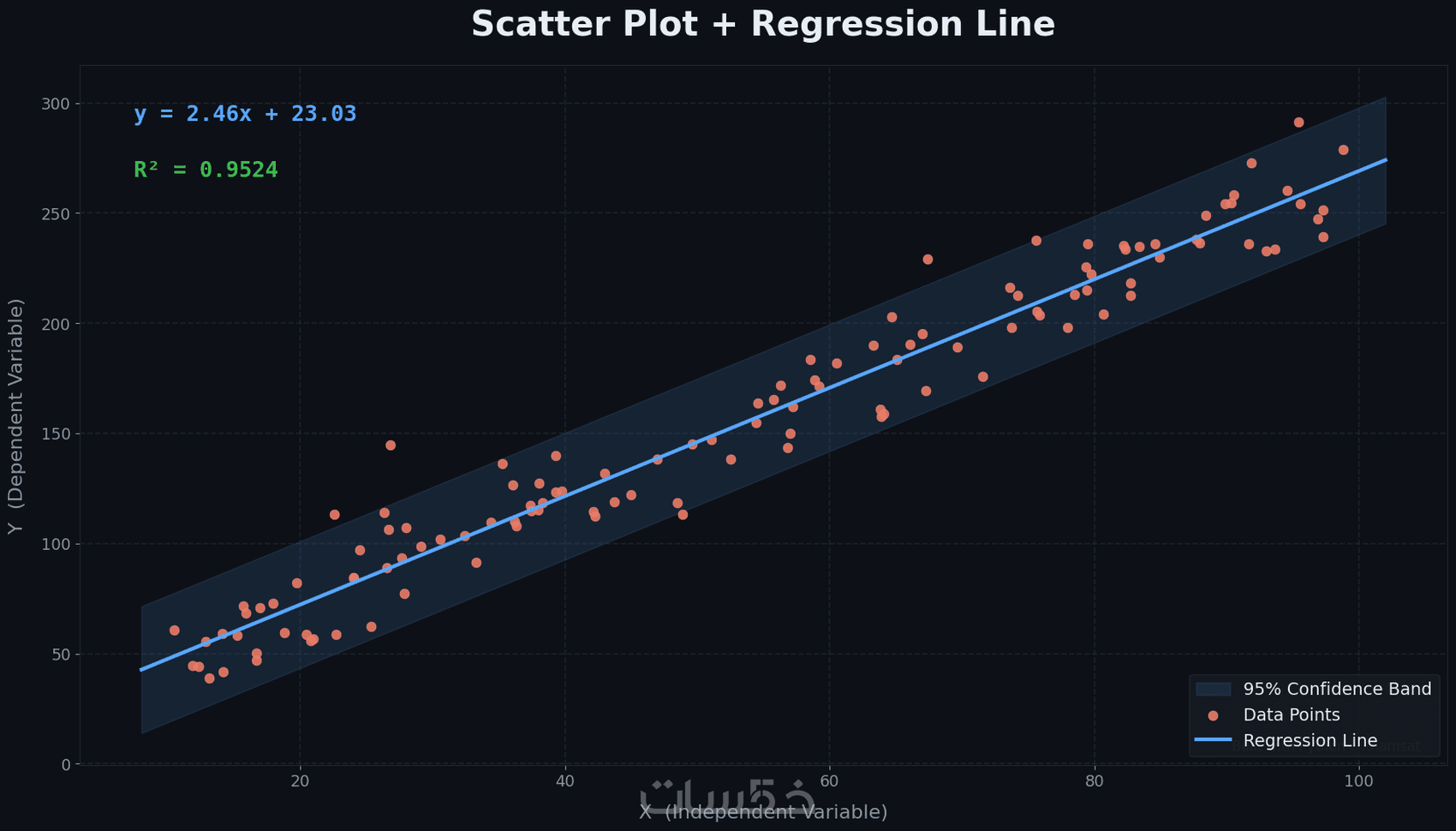 صورة عالية الجودة تحتوي على نقاط البيانات، وخط الانحدار، ونطاق الثقة ٩٥٪.