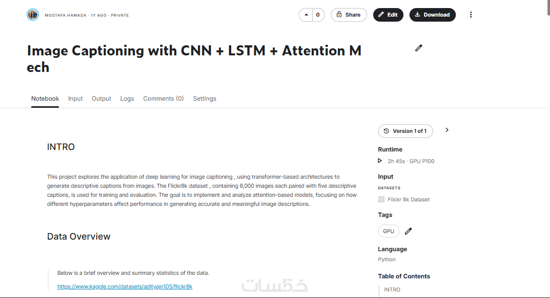 - تطبيق آلية الانتباه (Attention Mechanism) لتمكين النموذج من التركيز على الأجزاء المهمة من الصورة أثناء توليد كل كلمة.
