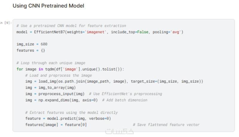 - استخدام شبكات CNN مثل ResNet أو VGG لاستخراج الخصائص البصرية من الصور.