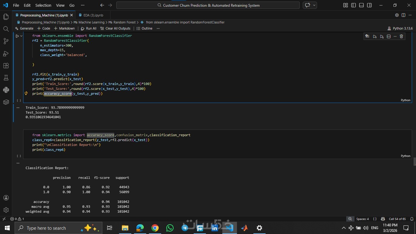 ملف (Jupyter Notebook أو .py) يحتوي على خطوات تجهيز البيانات، بناء النموذج، وتقييمه بشكل منظم وموثق والكود بأسلوب احترافي ومنظم، مع توثيقه بتعليقات (Comments) واضحة تشرح طريقة عمل النموذج، لتتمكن من الرجوع إليه أو تطويره بسهولة في المستقبل..