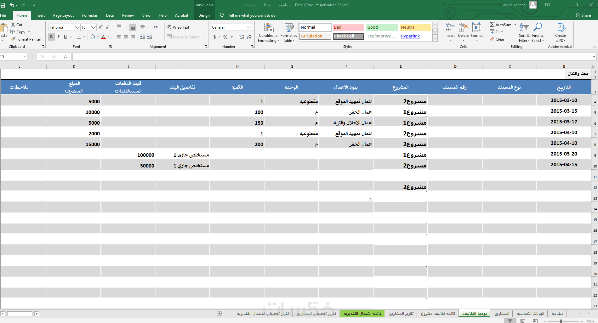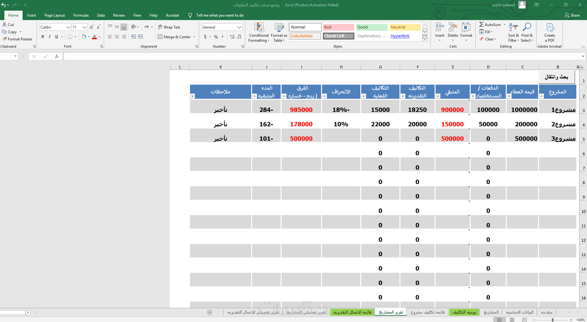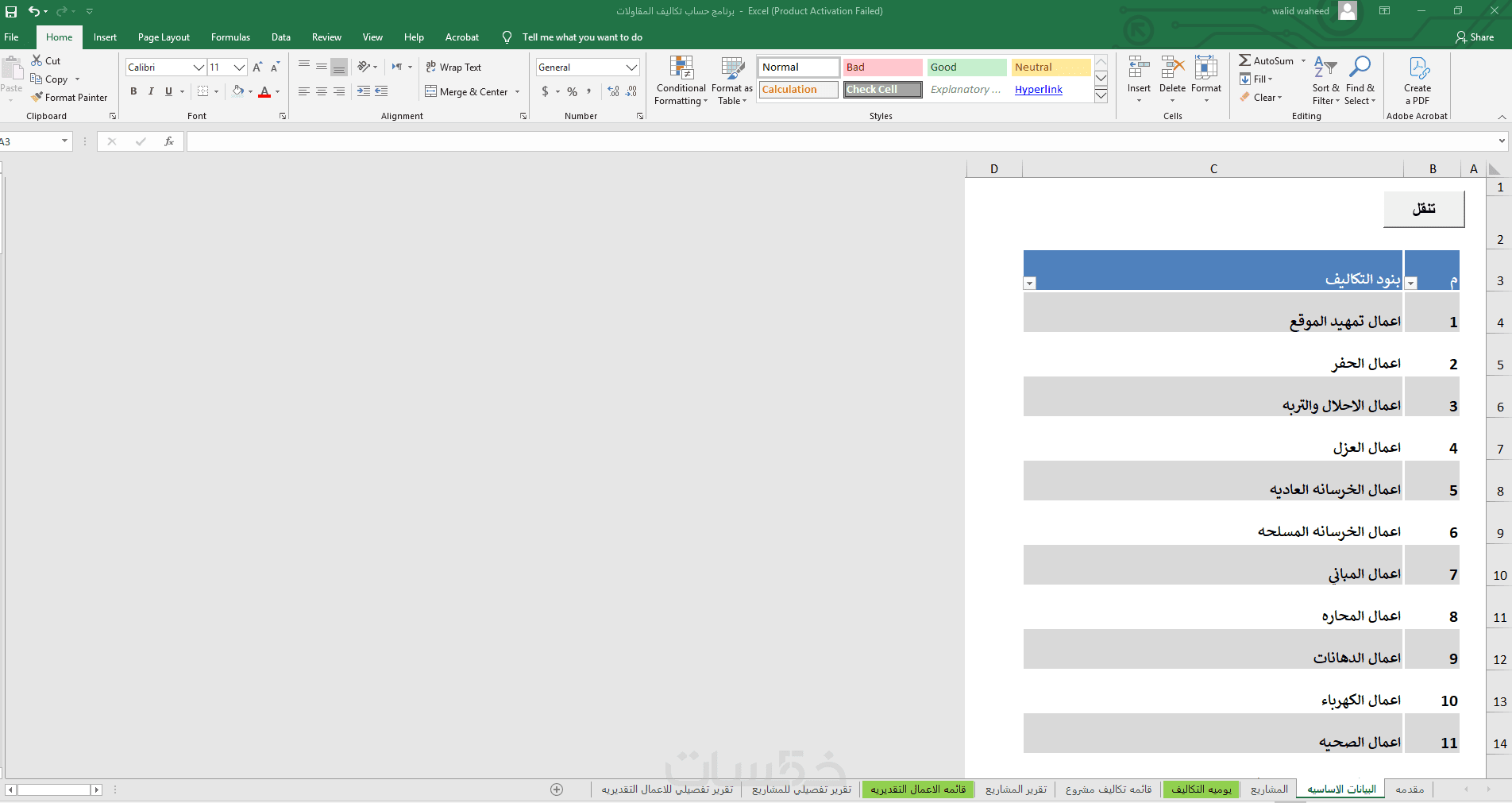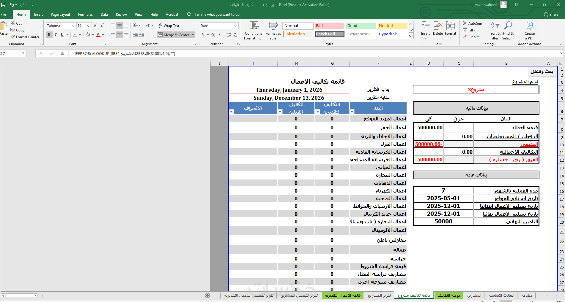 أقدم لك ملف Excel احترافي مصمم خصيصًا لإدارة وحساب تكاليف مشاريع المقاولات بشكل دقيق ومنظم، يساعدك على متابعة المصروفات وتحليل التكاليف واتخاذ قرارات مالية أفضل.