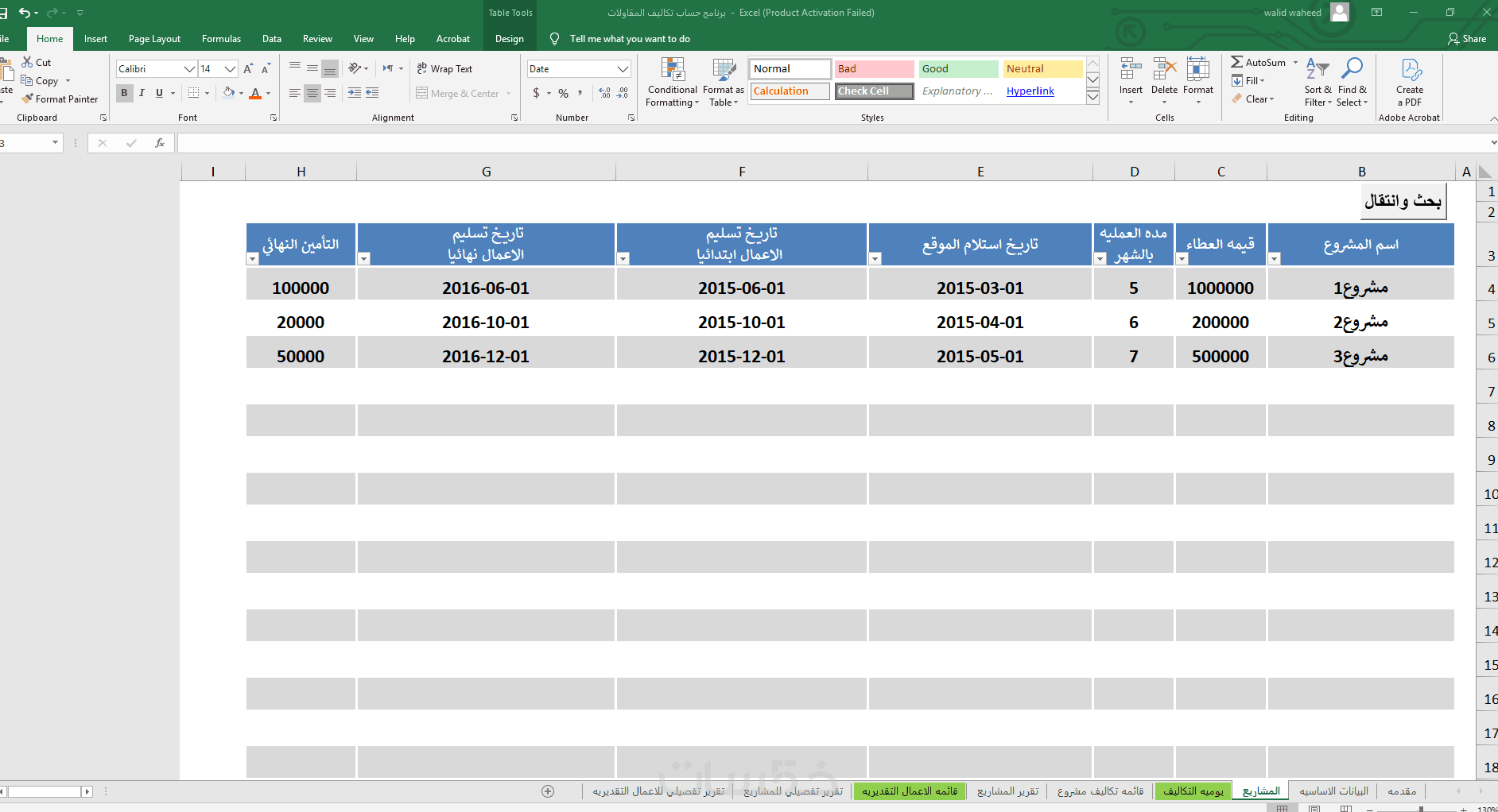 شيت التكاليف التفصيلية