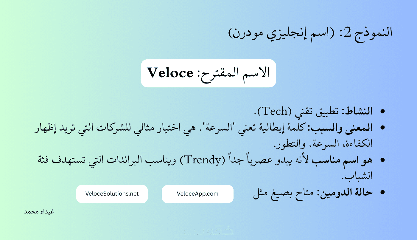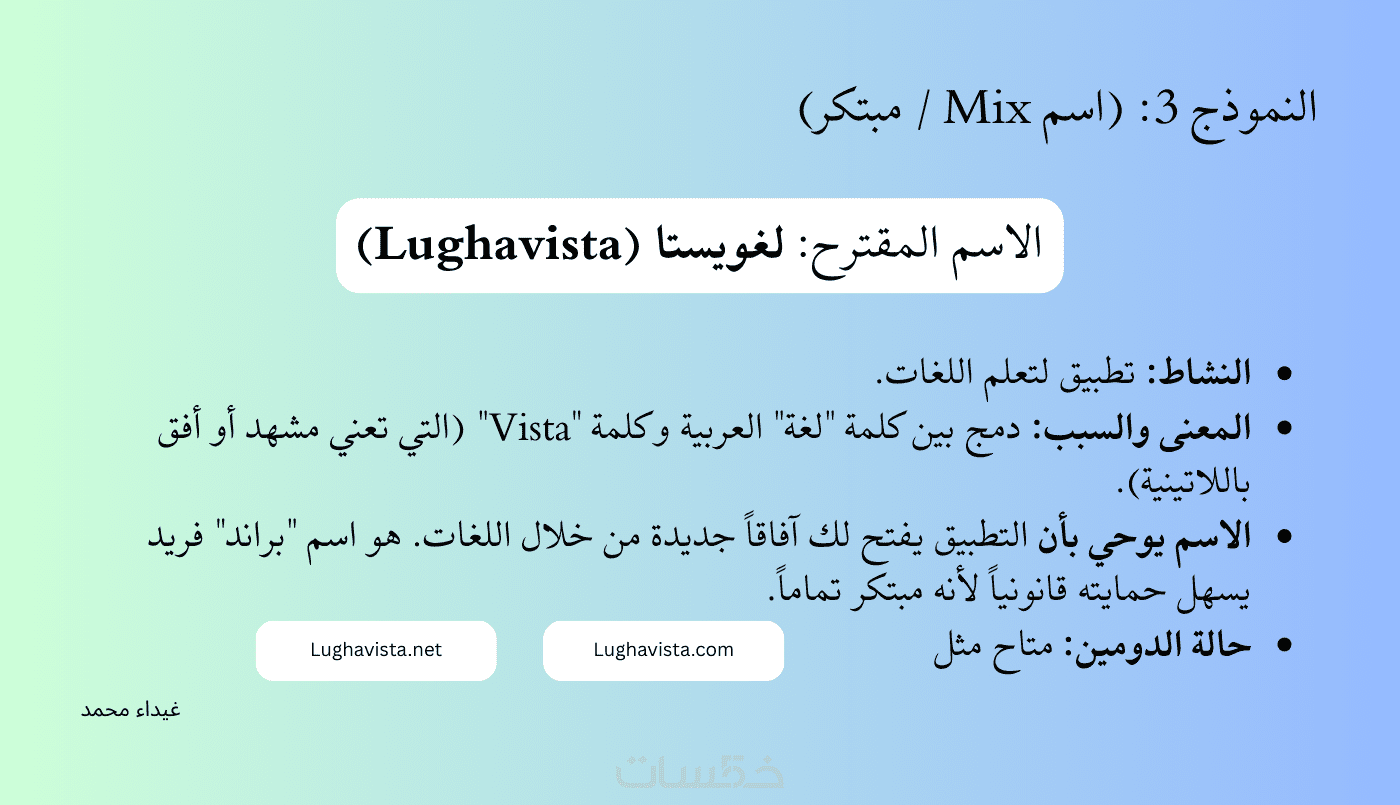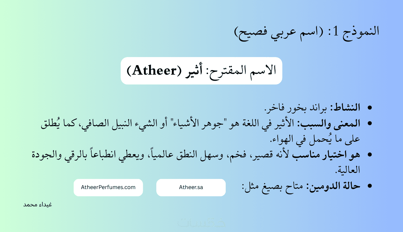 - نصيحة تسويقية حول كيفية استخدام الاسم لتعزيز هويتك التجارية.