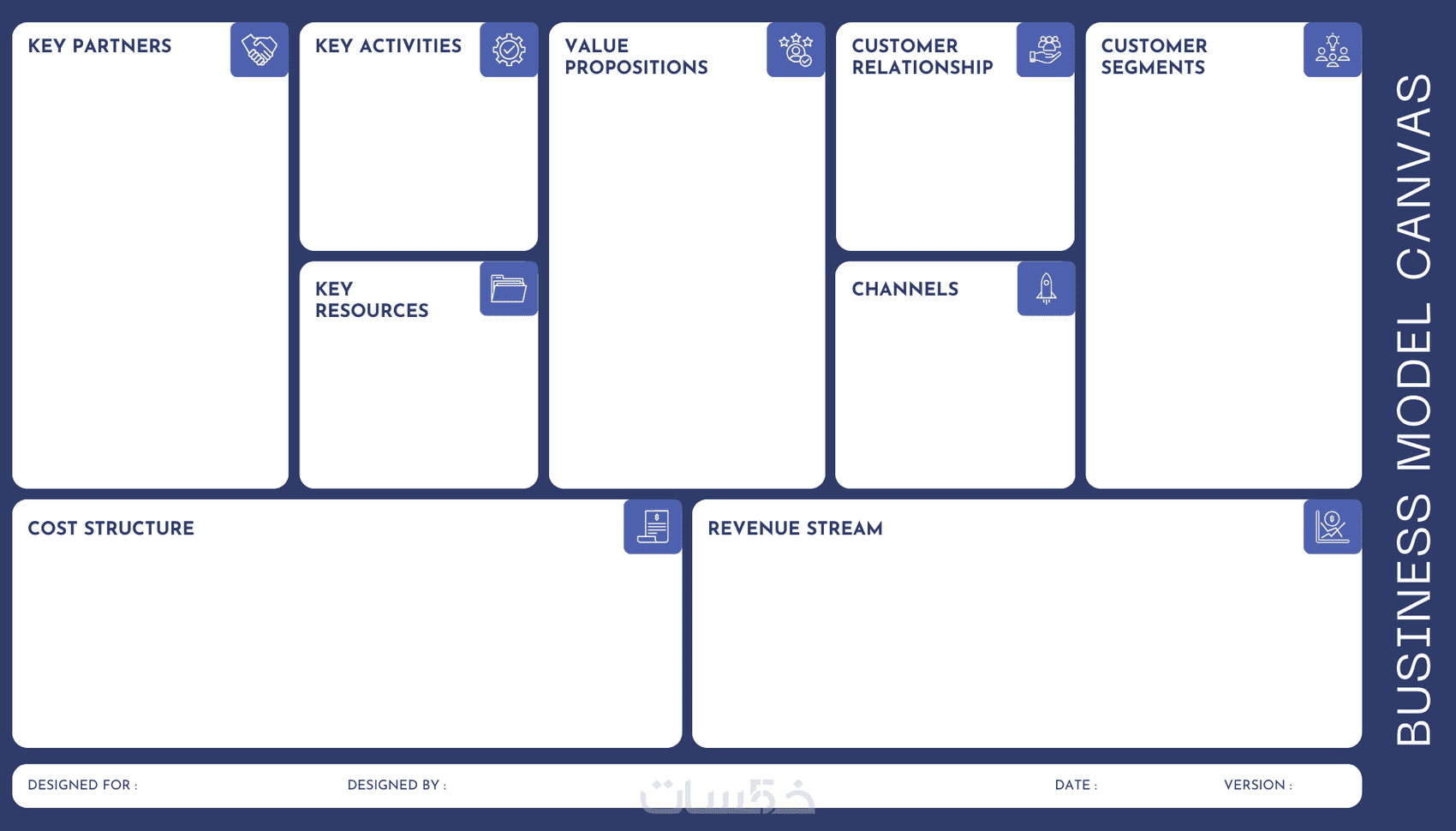 سيتم إعداد النموذج بناءً على فكرتك الخاصة وسيكون عبارة عن صفحة واحدة مقسمة إلى تسعة أجزاء لتوضيح جوانب الفكرة بشكل شامل على صفحة واحدة من العمل.