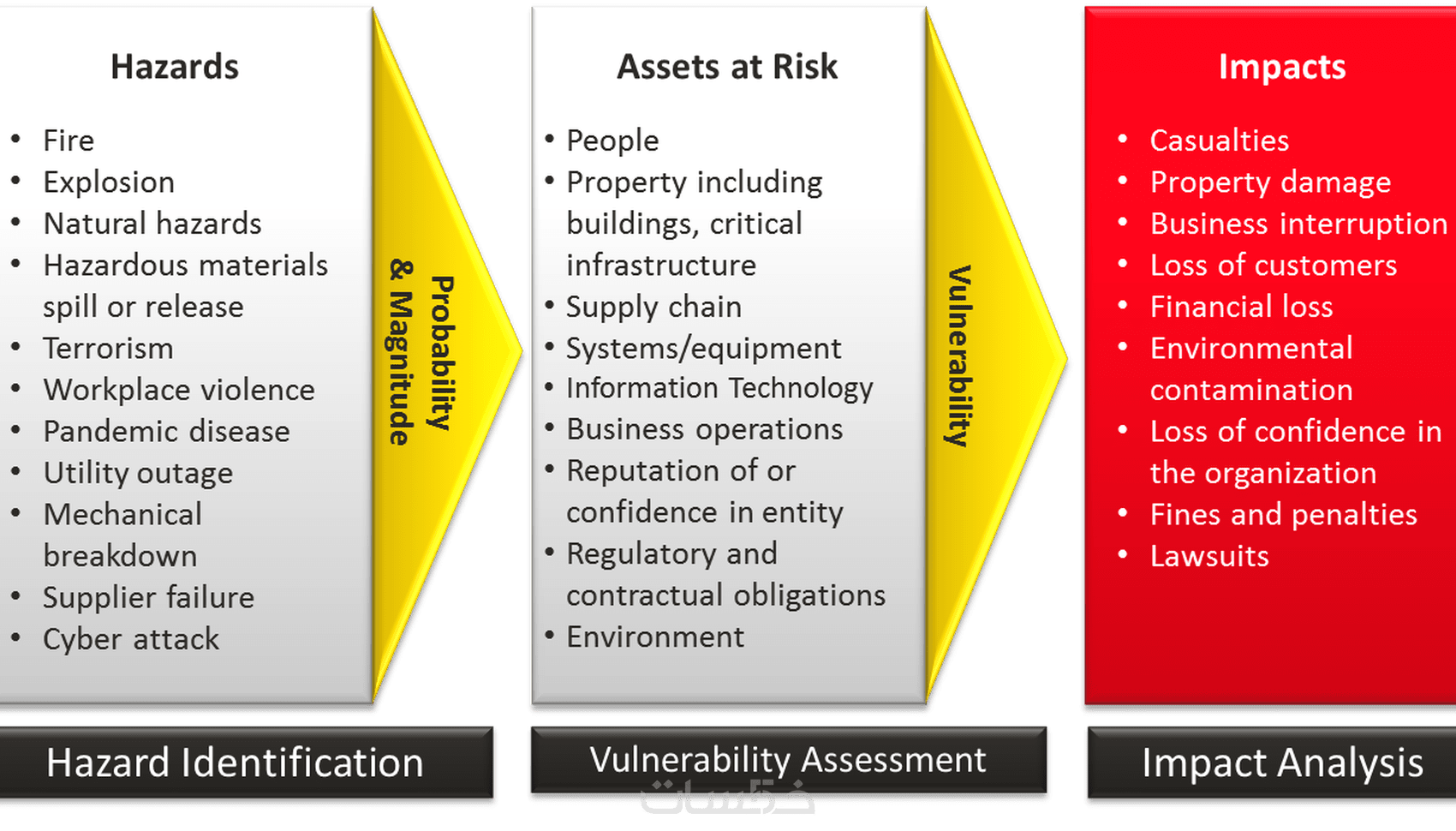 2. تحديد مدى تأثير المخاطر المحتملة على العاملين في بيئة العمل، والاحتمالية المرتبطة بحدوث هذه المخاطر.