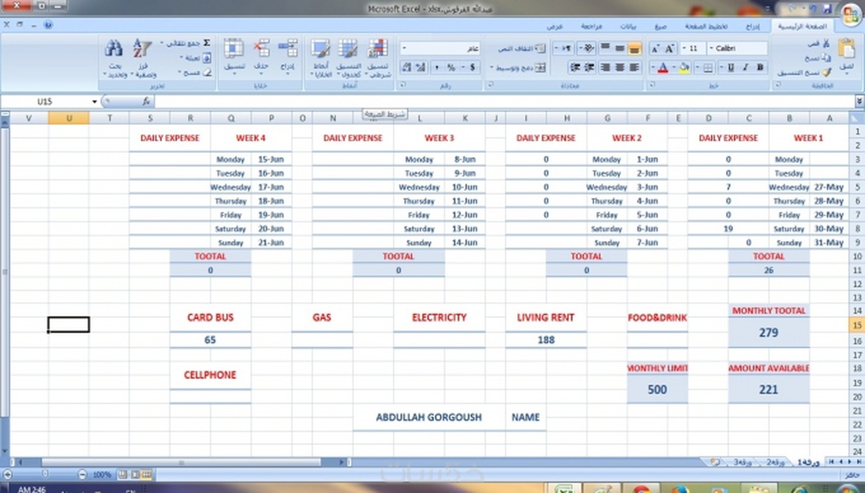 تصميم جدول مالي بسيط ببرنامج الاكسل يتيح لك تحديد مبلغ شهري خاص بك و معرفة مصروفك اليومي والاسبوعي واضافة رسوم تسديد الجوال والكهرباء ومصروفك للأكل والشرب والغاز وكل شي ومعرفة المبلغ المتبغي لك خلال الشهر لكي تحافظ على مالك وتستطيع معرفة مالذي اشتريته هذا الشهر برنامج جدا ممتاز وبسيط بكل معنى الكلمة .