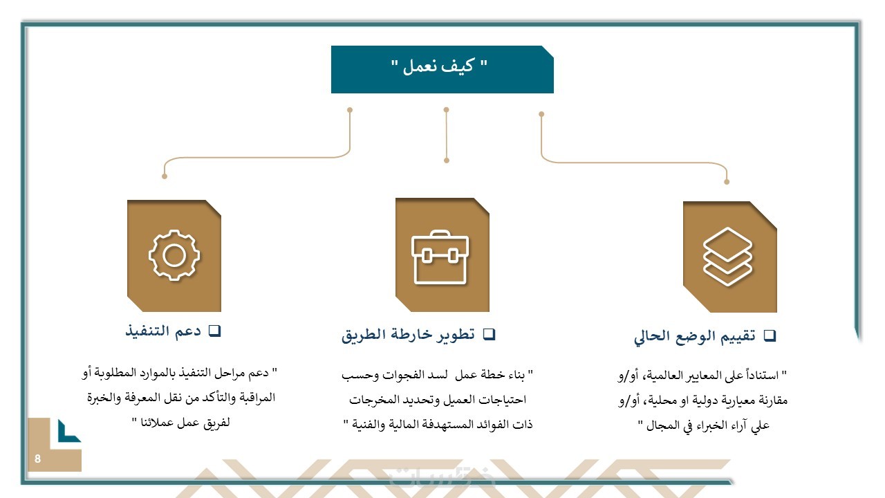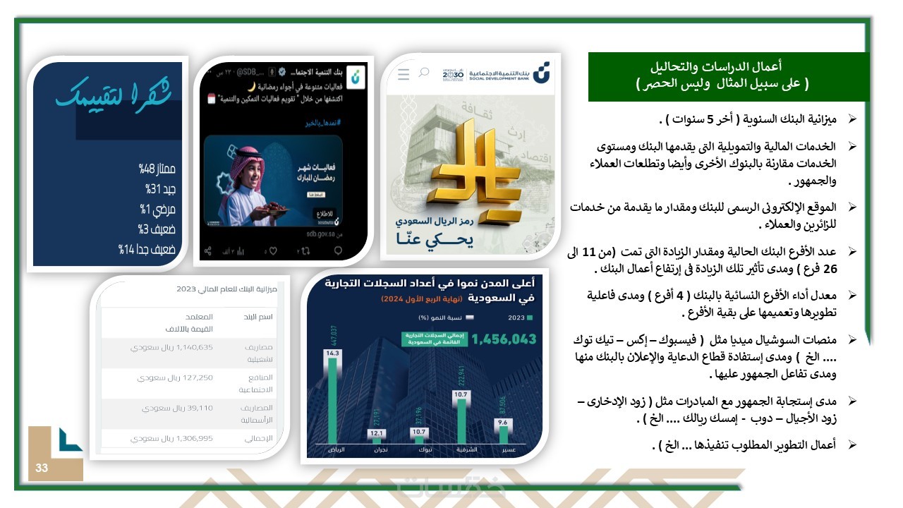 - تقييم الوضع الحالي لأعمالك بصورة عامة أو في بعض الأقسام المتخصصة وتوضيح مقترحات النهوض بالعمل ورفع جودته.