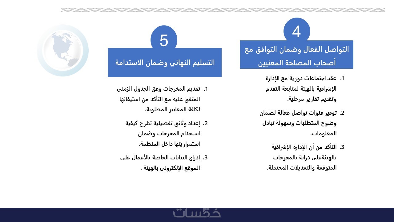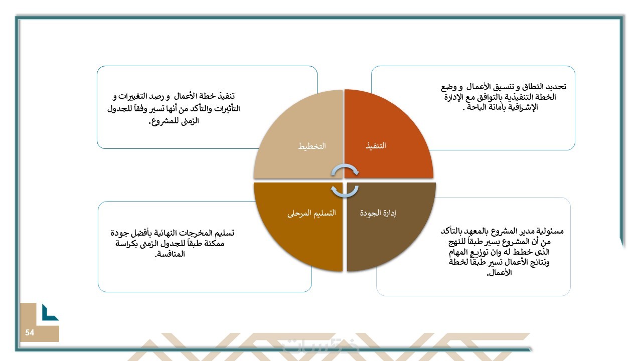 - اتخاذ الخطوات الصحيحة والقرارات المناسبة المتعلقة بتنفيذ المشروع.
