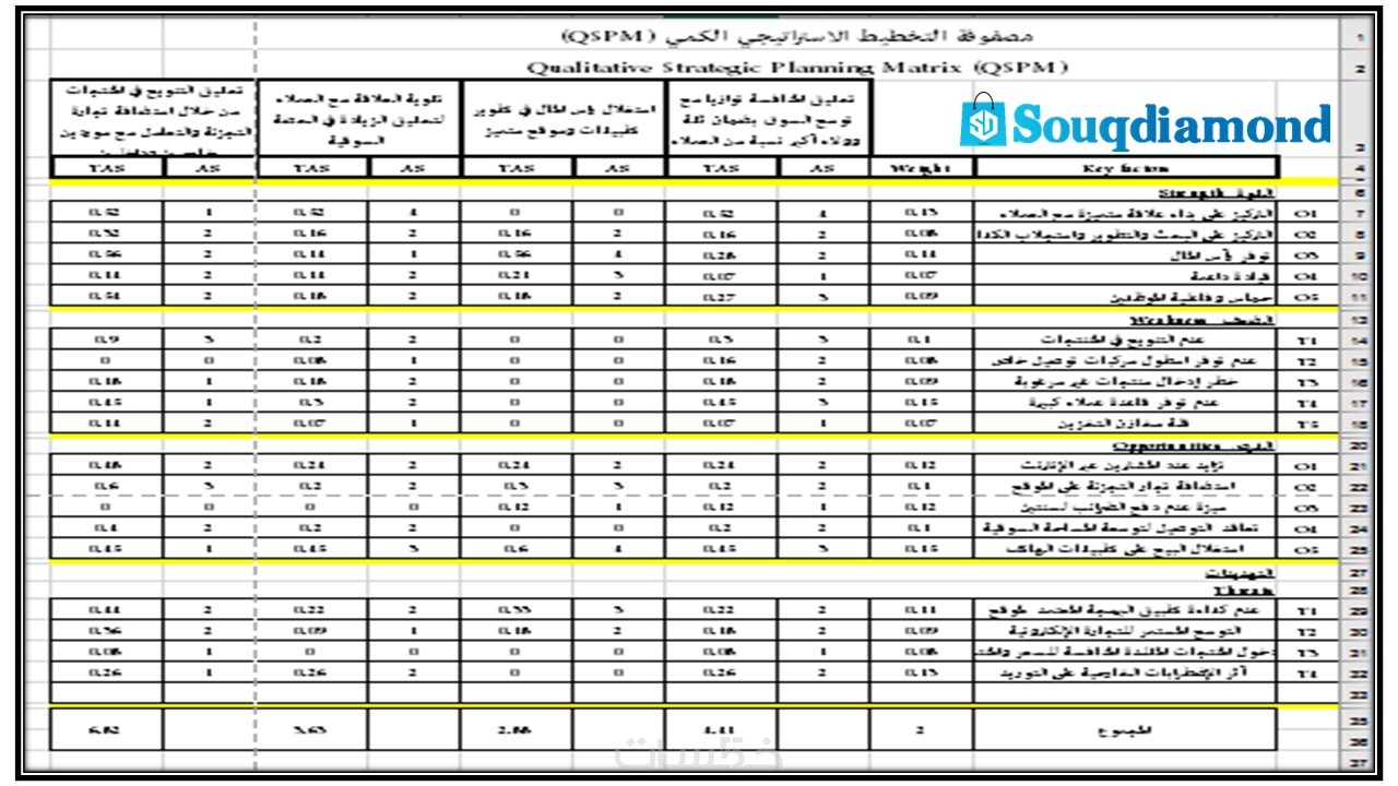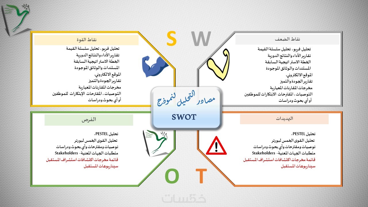 تحليل SWOT:تقييم نقاط القوة والضعف والفرص والتهديدات لتحديد استراتيجيات التحسين.