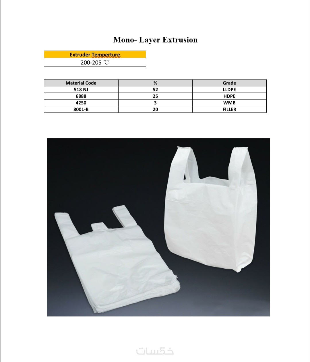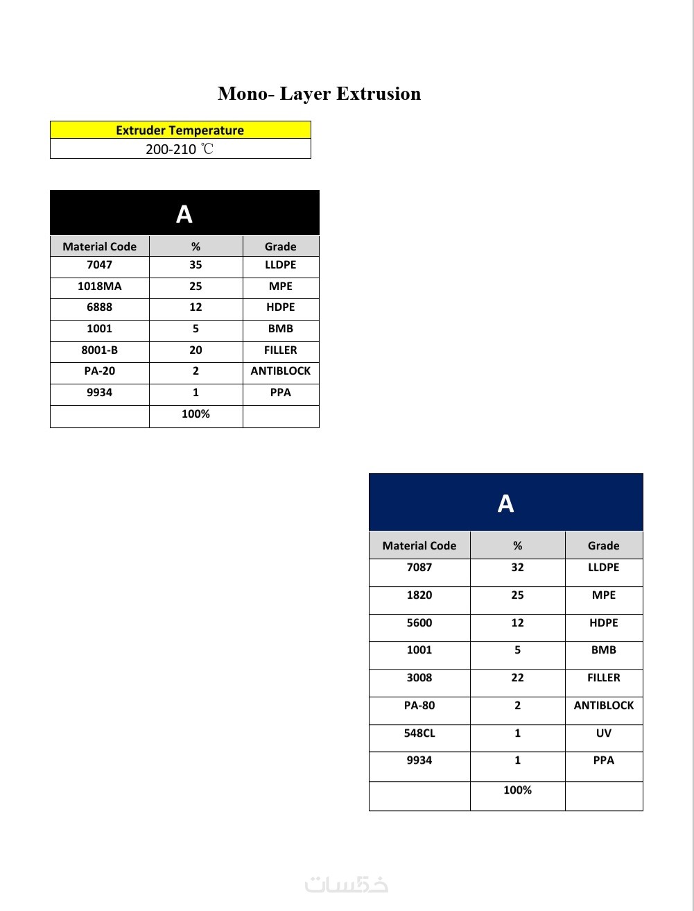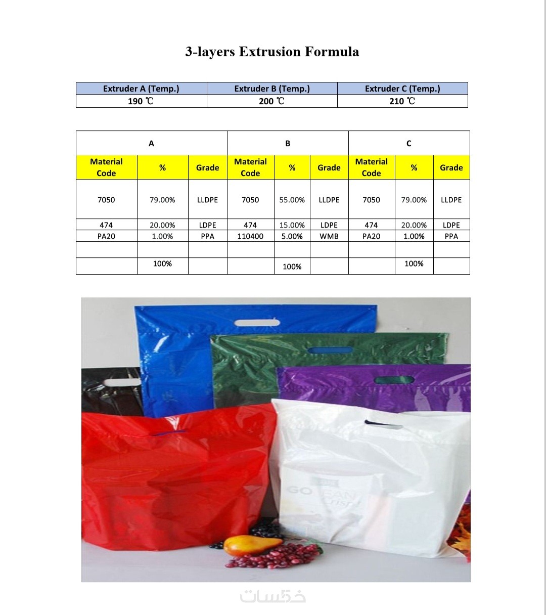 ملف شامل لخلطة المواد ( المواد البكر و الموعاد تدويرها وكافه الاضافات الازمة ) مع كافة ظروف التشغيل بالماكينات الخاصة بمصنعك