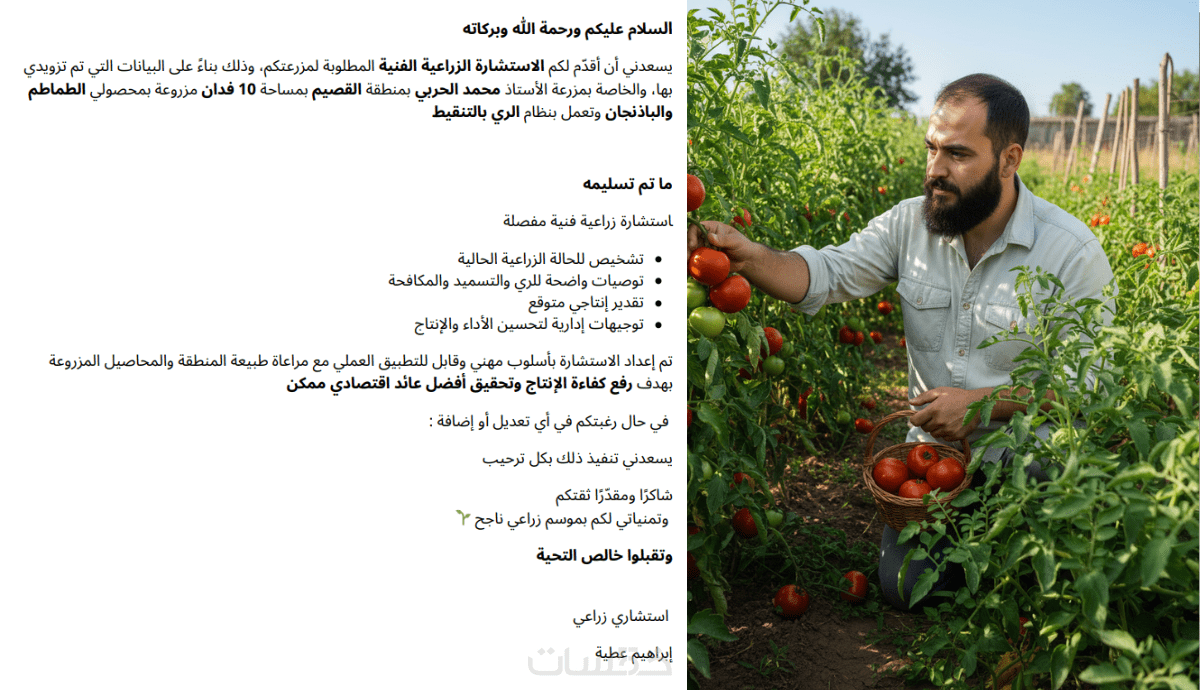 أقدّم لك عدد واحد استشارة زراعية متخصصة تساعدك على زيادة الإنتاج وتقليل التكاليف بناءً على ظروف مزرعتك أو مشروعك