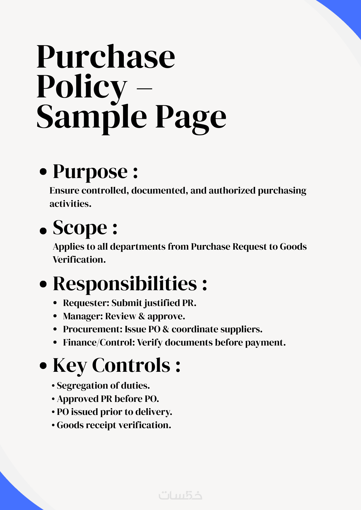 - هيكل سياسة متكامل يشمل: (الغرض- النطاق- المسؤوليات- خطوات الإجراء- الضوابط الرقابية).