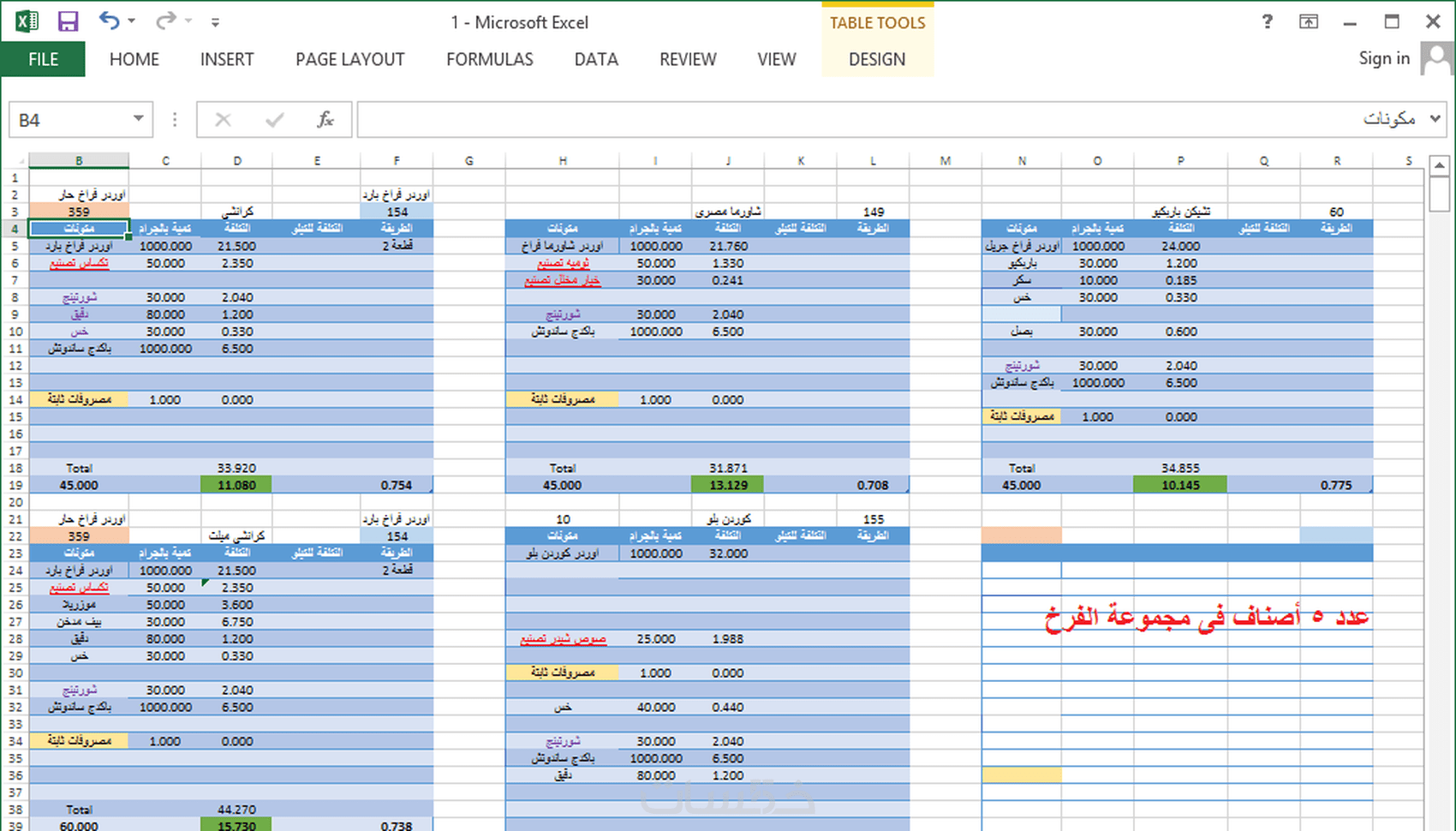 *فى الشيت الثانى يحتوى على اسم مجموعة المواد المراد حساب تكلفتها وكل مجموعة بها 5 أصناف فقط ومكونات الصنف كما يطلبها العميل بدون حد اقصى.