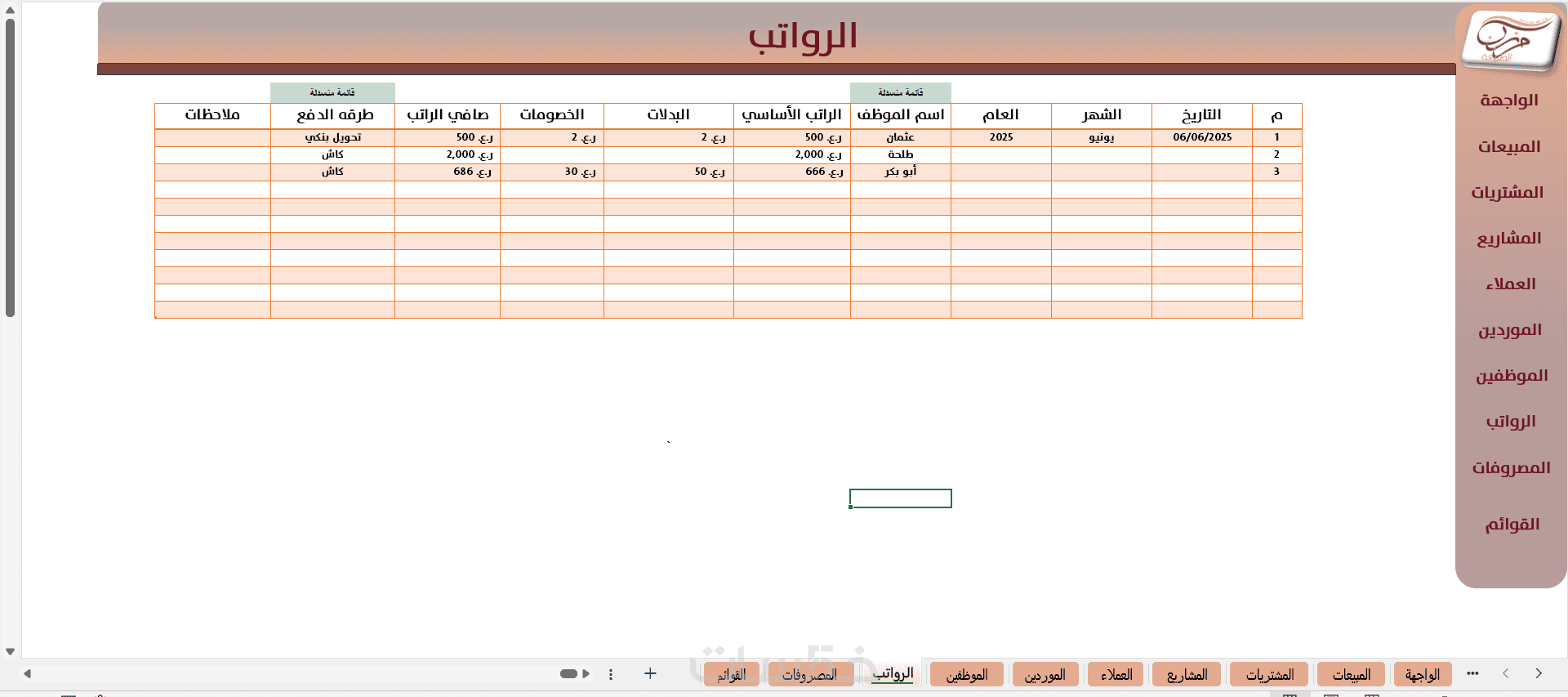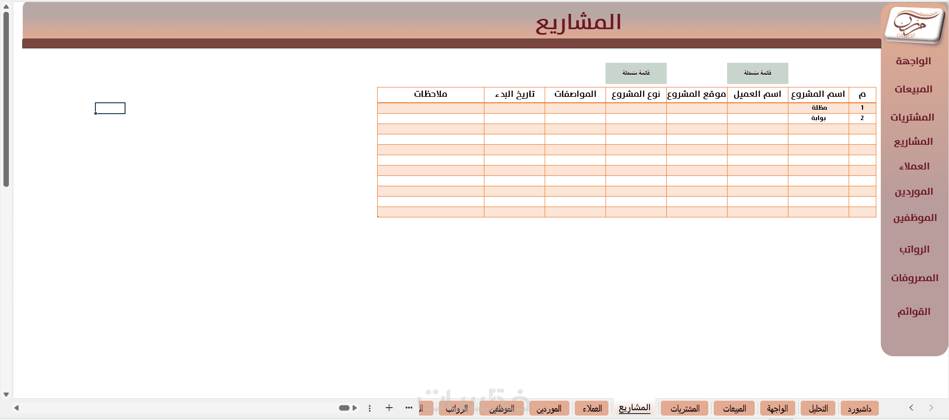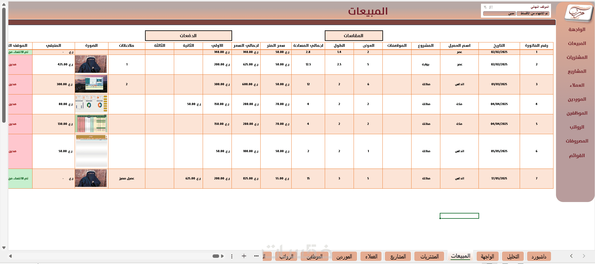(6 شيتات - شيت المبيعات -شيت المشتريات- شيت العملاء -شيت الموردين - شيت المصروفات- قائمة الدخل )