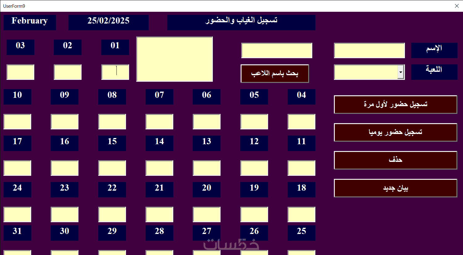 5-زر لتسجيل الحضور والغياب للاعبين على مدار شهور السنة