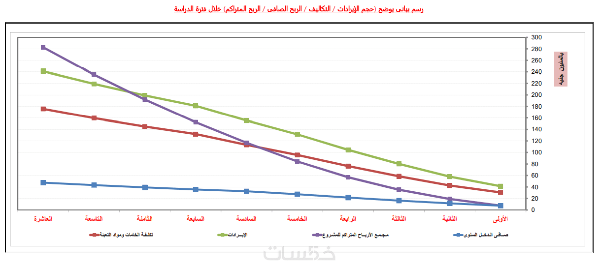 الدراسة تعرض ملخص التكاليف الإستثمارية وتكاليف التشغيل والإيرادات وقوائم الدخل وهامش الربح والمؤشرات الإقتصادية