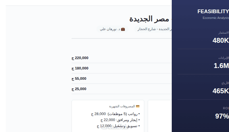 خبير في إعداد وتحليل دراسات الجدوى المتكاملة للمشاريع الاستثمارية والريادية. أمتلك منهجية تحليلية دقيقة تجمع بين الدراسات السوقية الشاملة والتحليل المالي المتقدم وتقييم المخاطر الاستراتيجية. متخصص في تحويل الأفكار إلى مشاريع قابلة للتنفيذ .