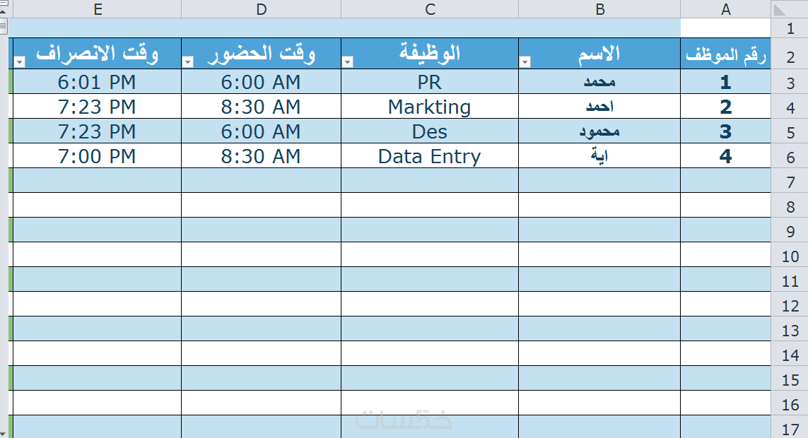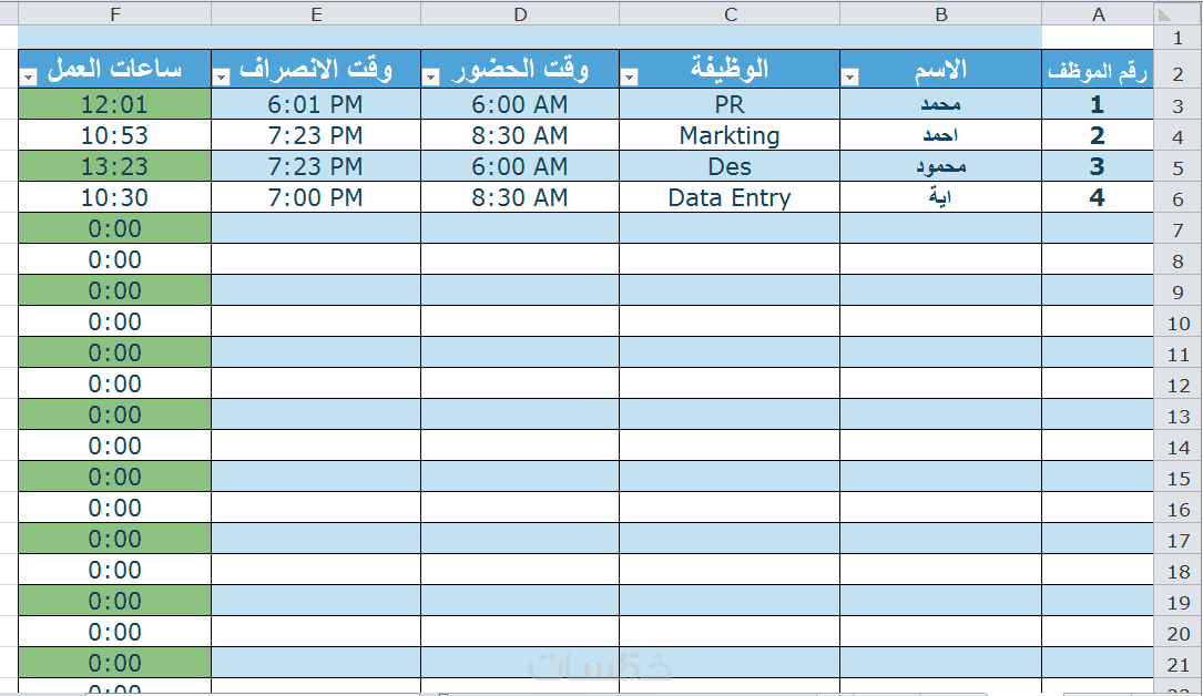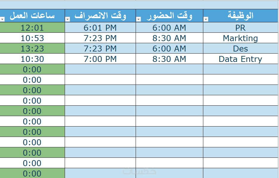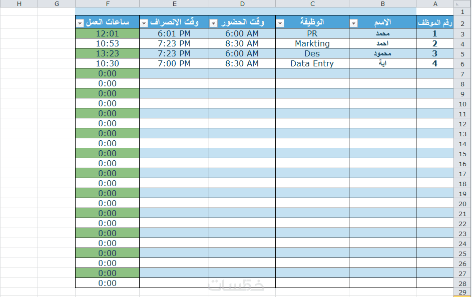 ما عليك سوا كتابة وقت الحضور ووقت الانصراف والمعادلة ستقوم بحساب عدد ساعات العمل لهذا الموظف