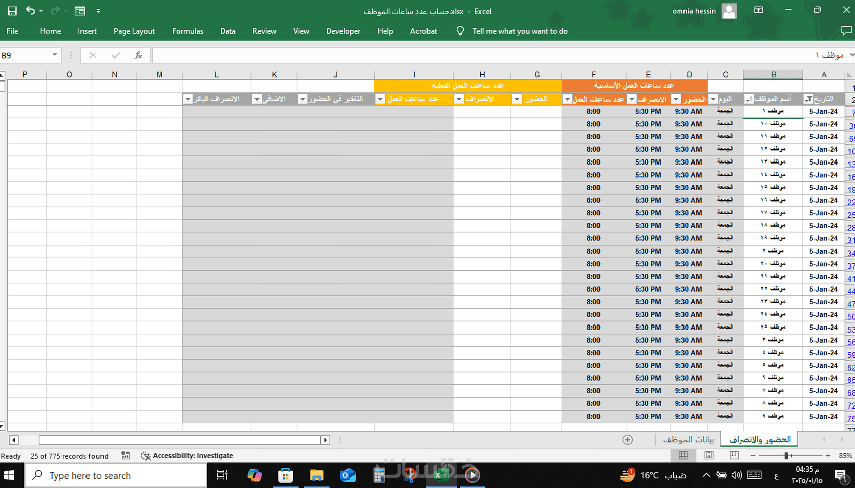 "شيت Excel لتسجيل الحضور والانصراف لـ 25 موظفًا (مع إمكانية زيادة العدد).