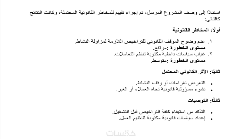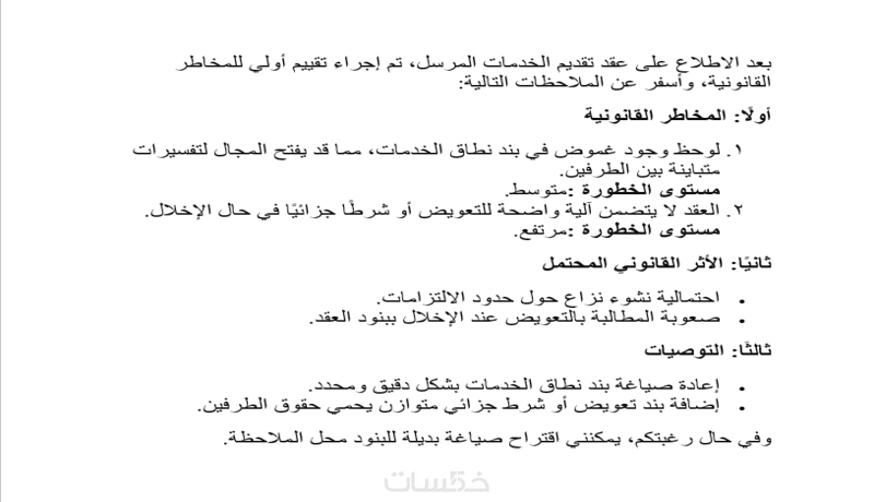 الخدمة استشارية تحليلية ولا تشمل تمثيلًا قانونيًا أمام الجهات القضائية.