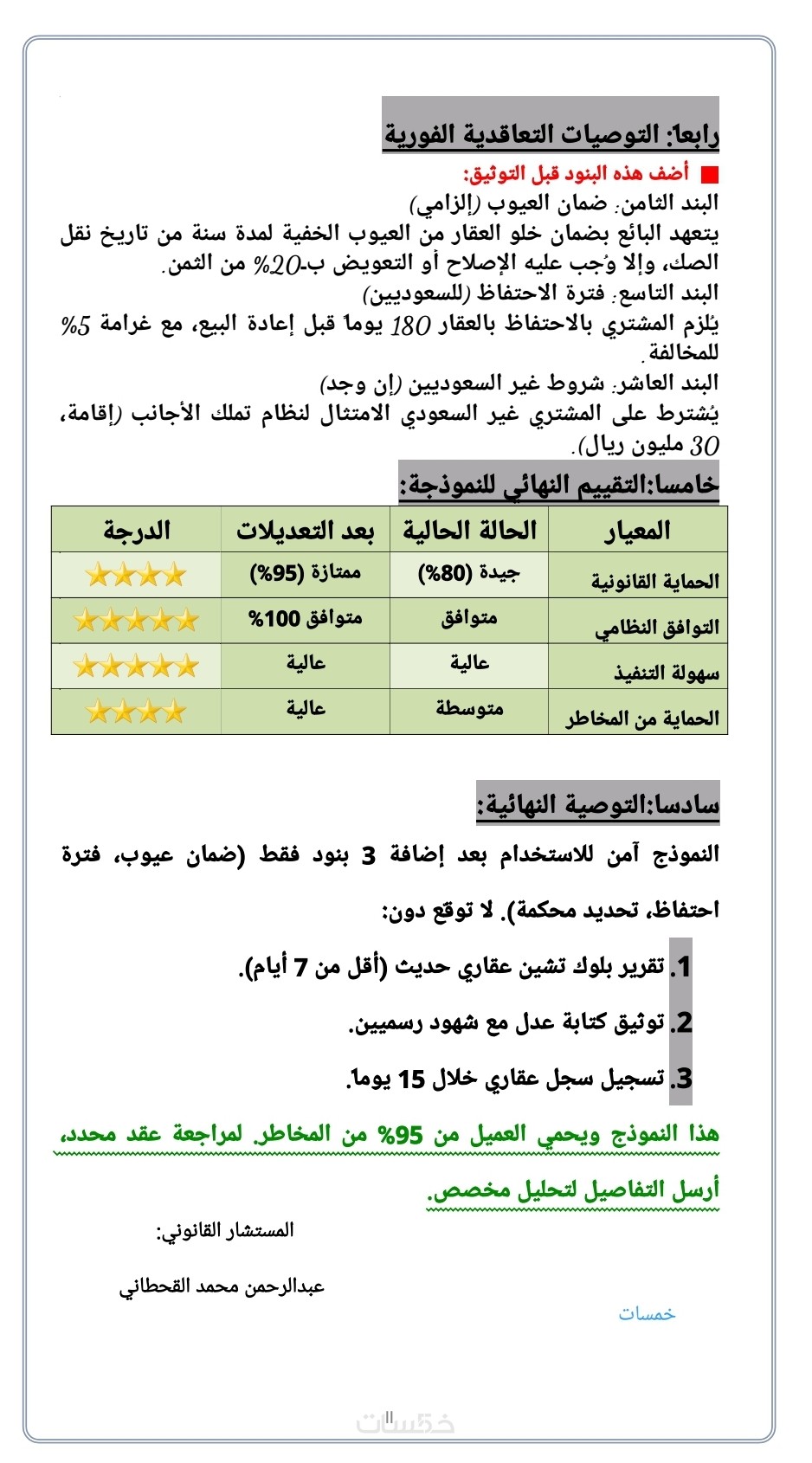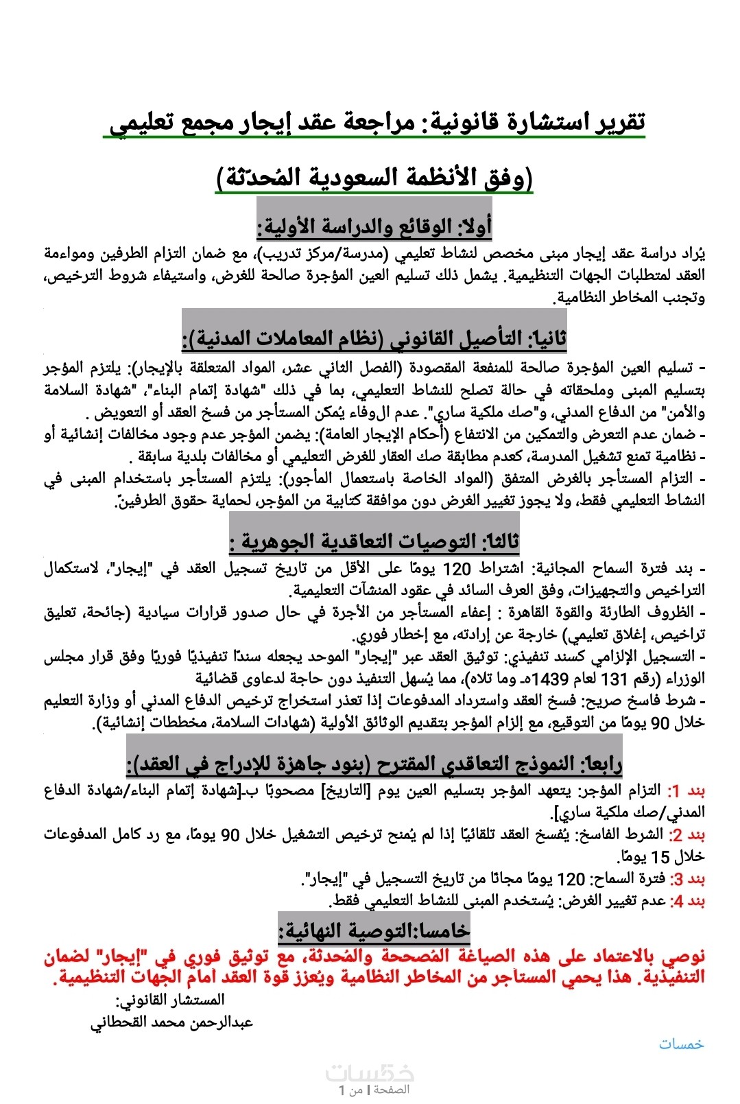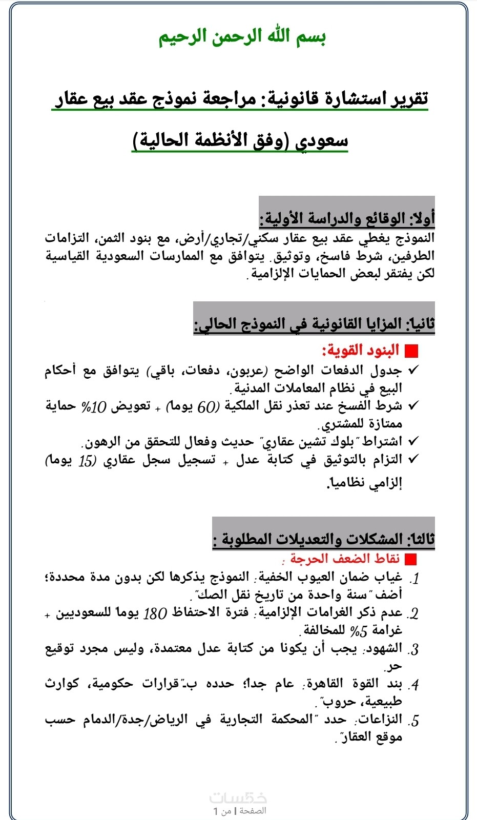 ستستلم تقريراً استشارياً رصيناً وموجزاً في صفحة واحدة، يتضمن تحليلاً دقيقاً لموقفك القانوني وتأصيلاً نظامياً وشرعياً مدعوماً بمواد الأنظمة السعودية والخليجية ذات الصلة، مع توصية نهائية واضحة بالخطوات الواجب اتخاذها، ويتم تسليم العمل بصيغتي Word وPDF جاهزتين للطباعة أو التعديل الفوري.