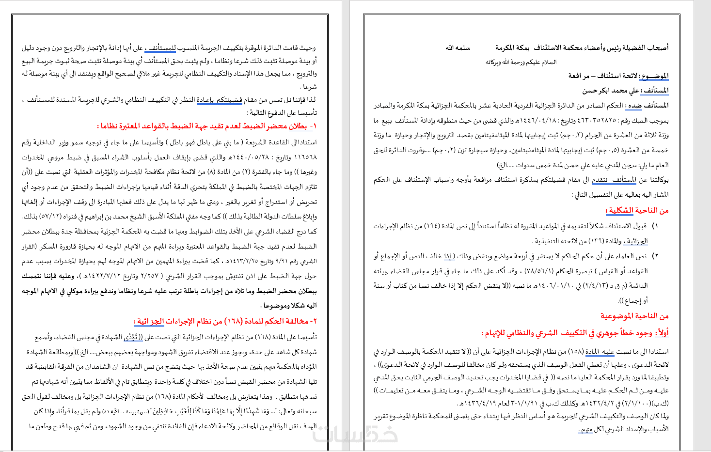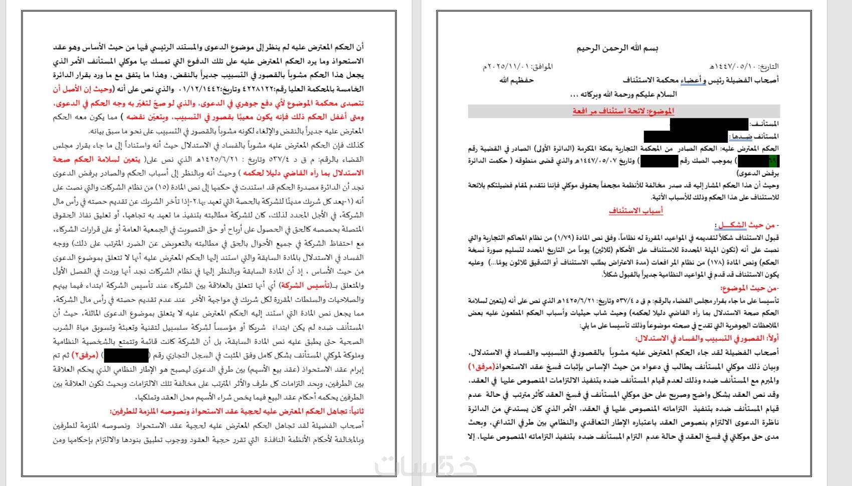 عرض منهجي ومنظم يشمل: (الوقائع – الدفوع – الأسانيد النظامية – المبادئ القضائية).