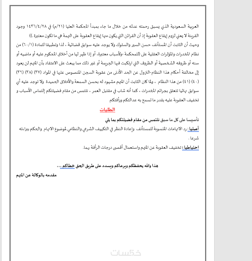 مذكرة دفاع احترافية لا تقل عن (1500 كلمة)، مكتوبة بأسلوب منهجي واضح ومنظم، يعكس قوة الطرح وسلامة التكييف القانوني.