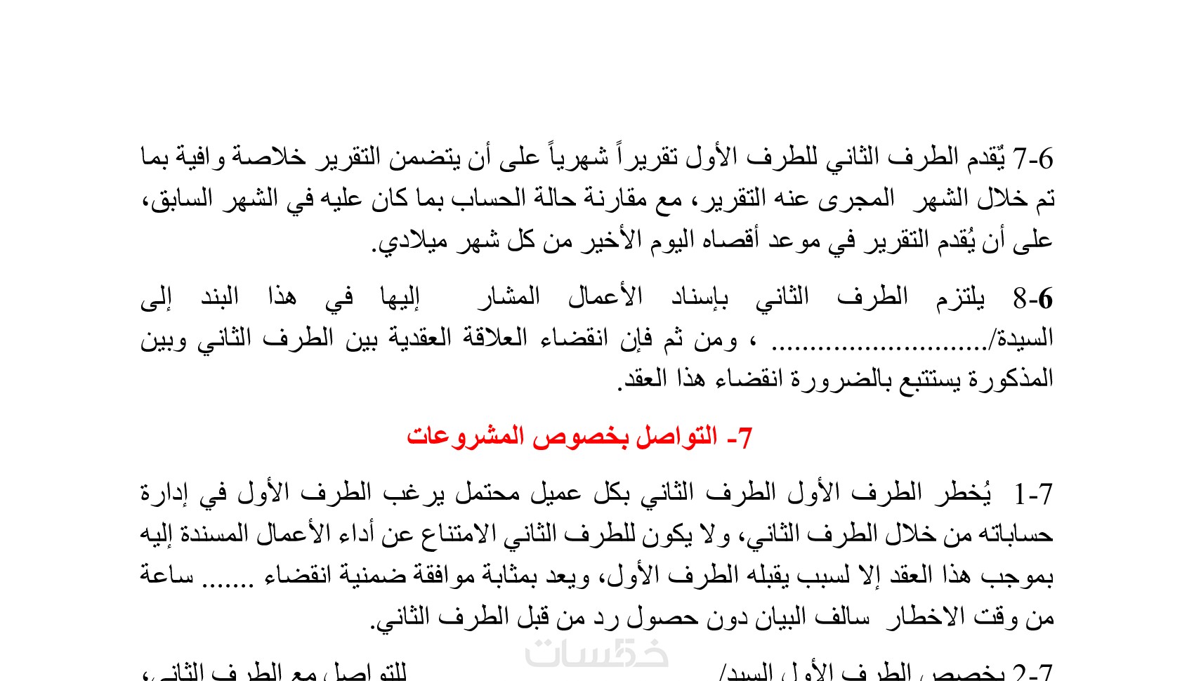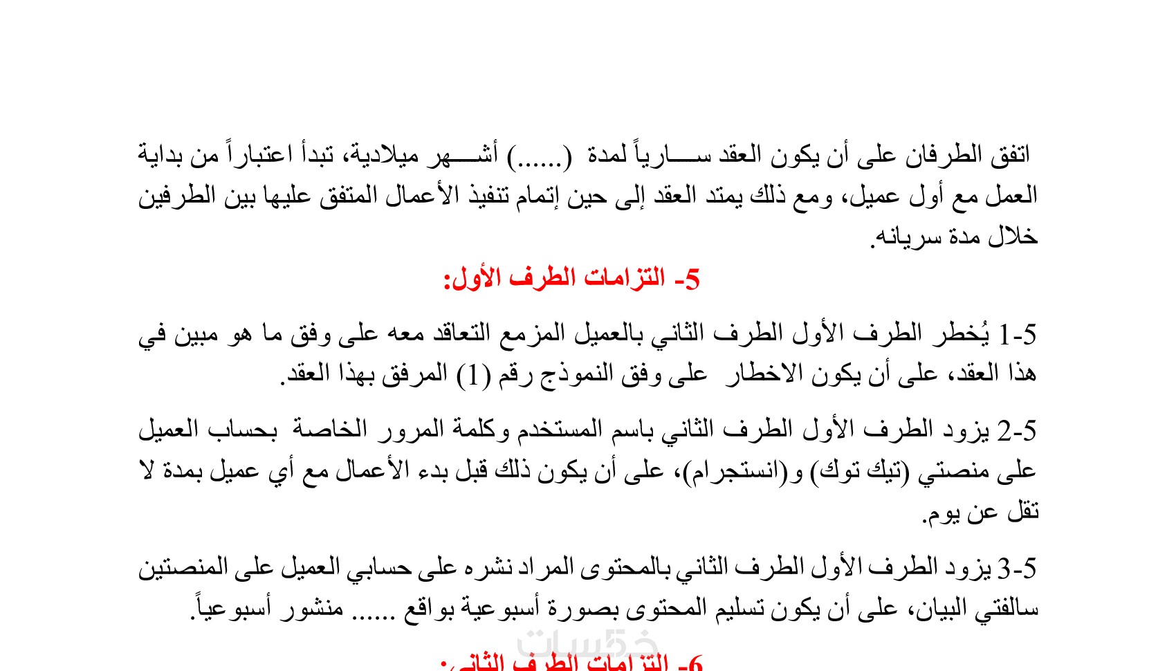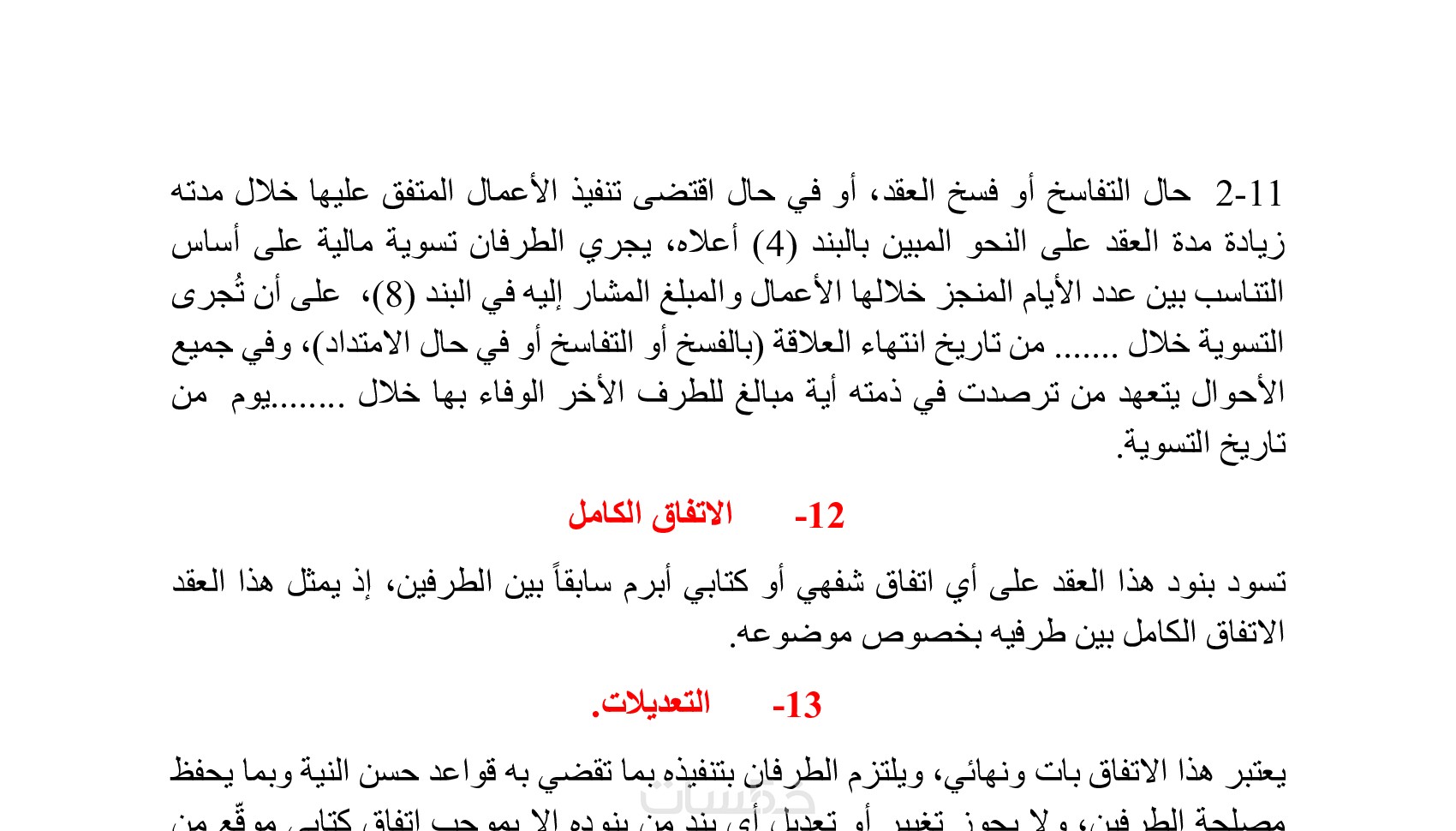 الخدمة عبارة عن عقد باللغة العربية مكون من 15 بند.