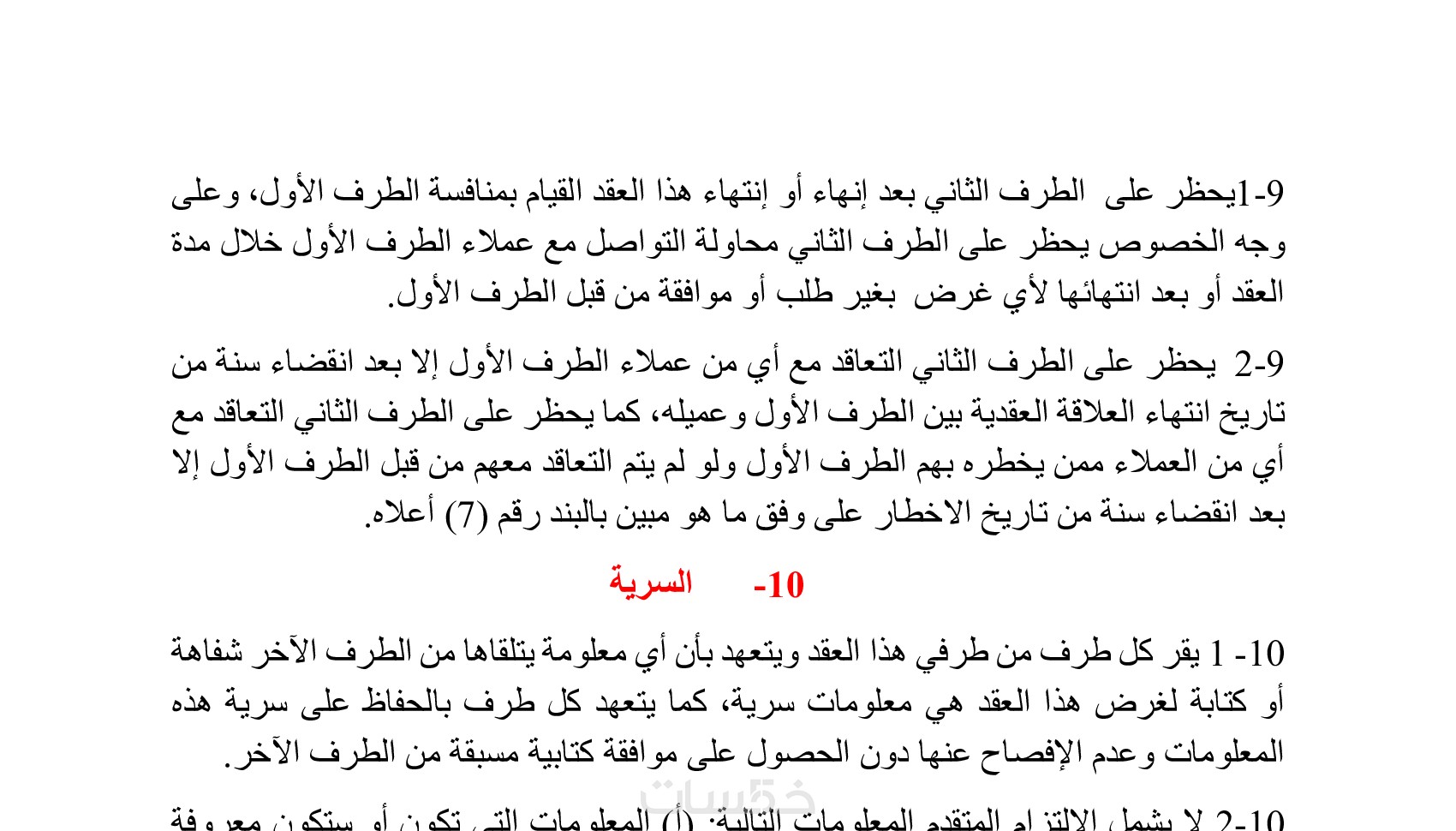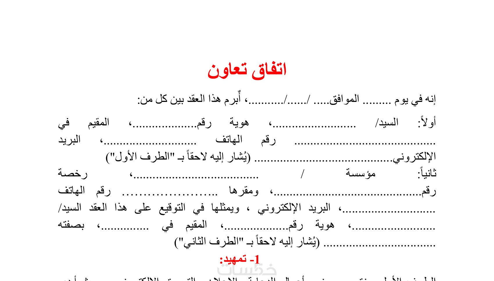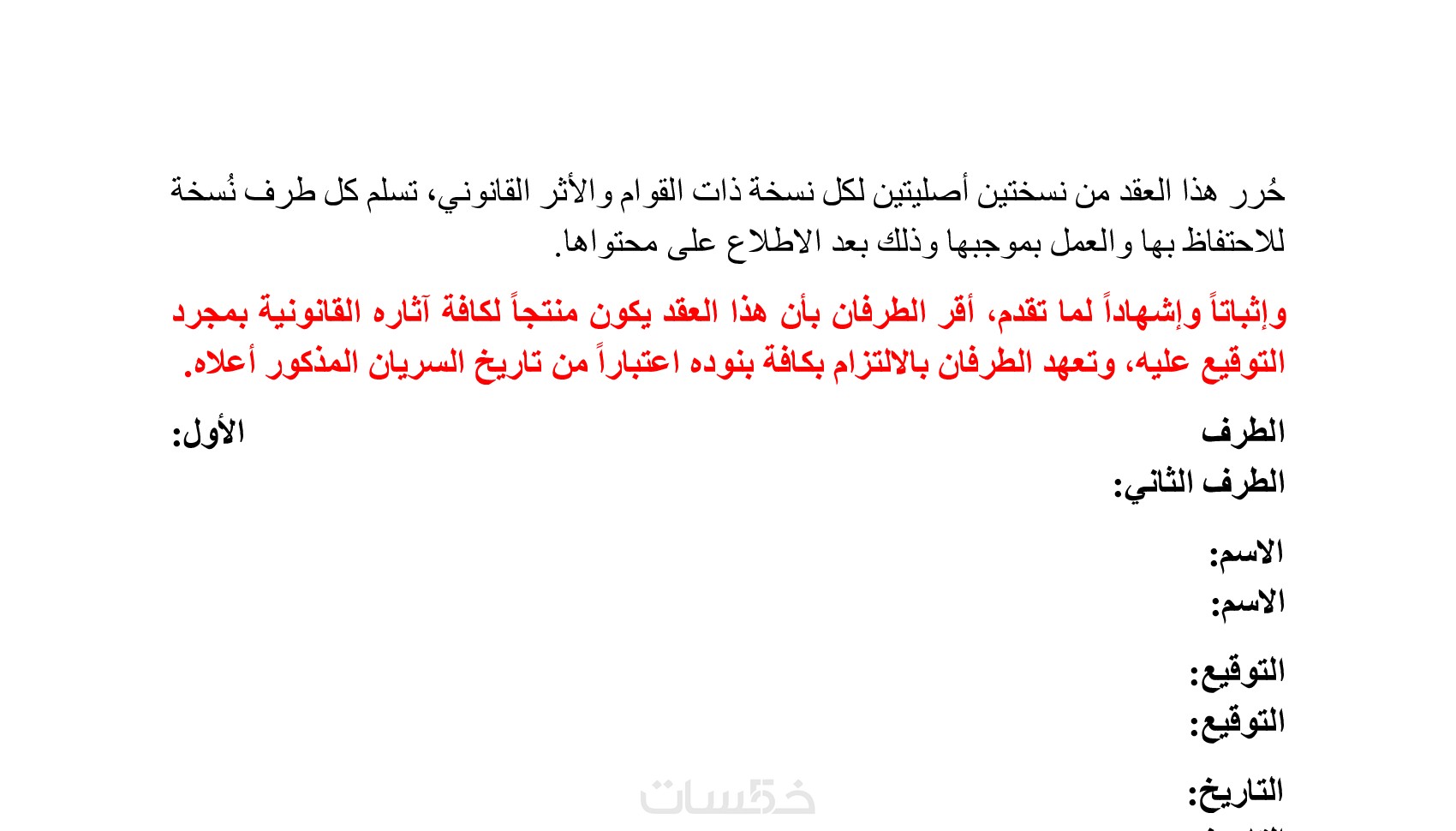 الخدمة عبارة عن عقد باللغة العربية مكون من 15 بند.