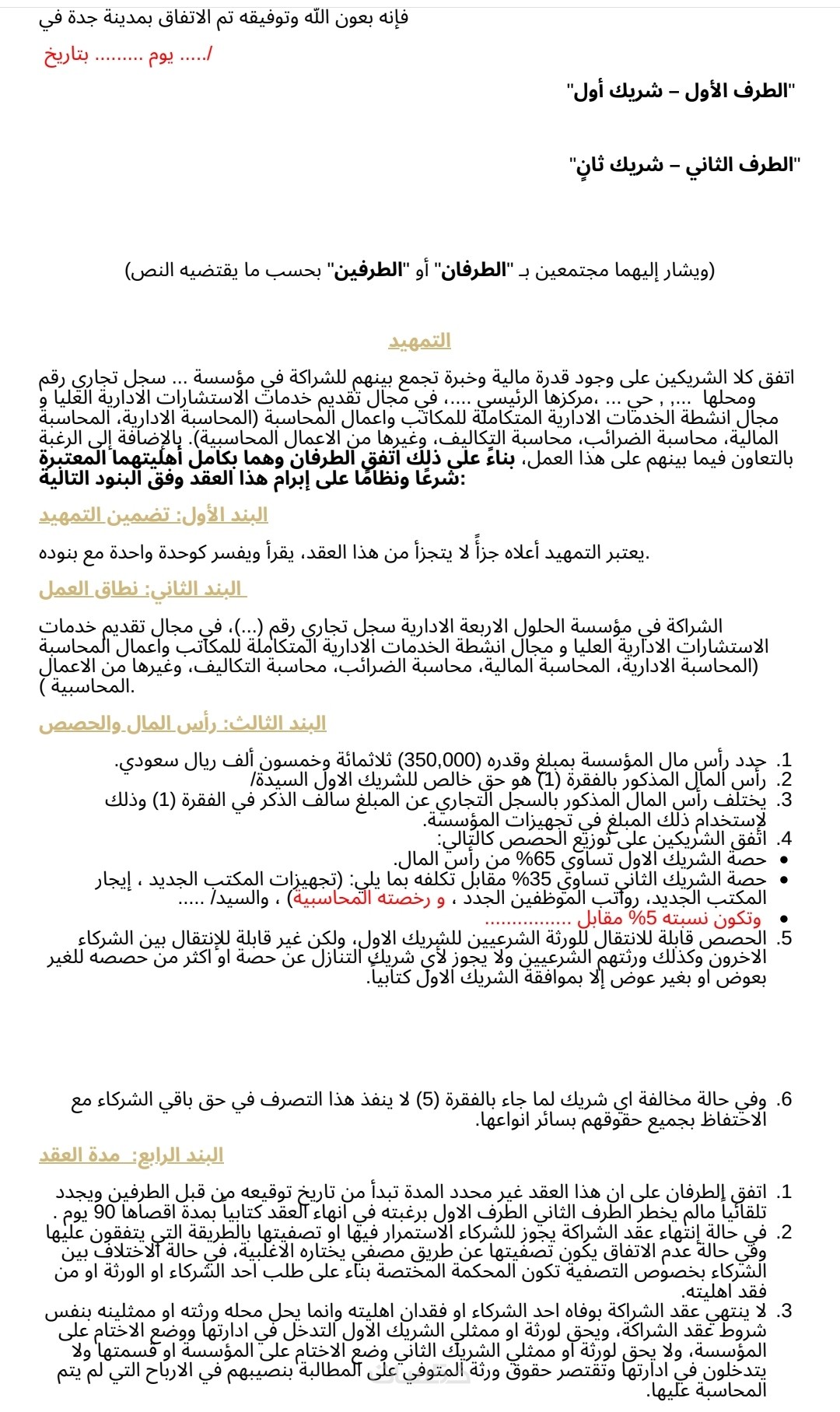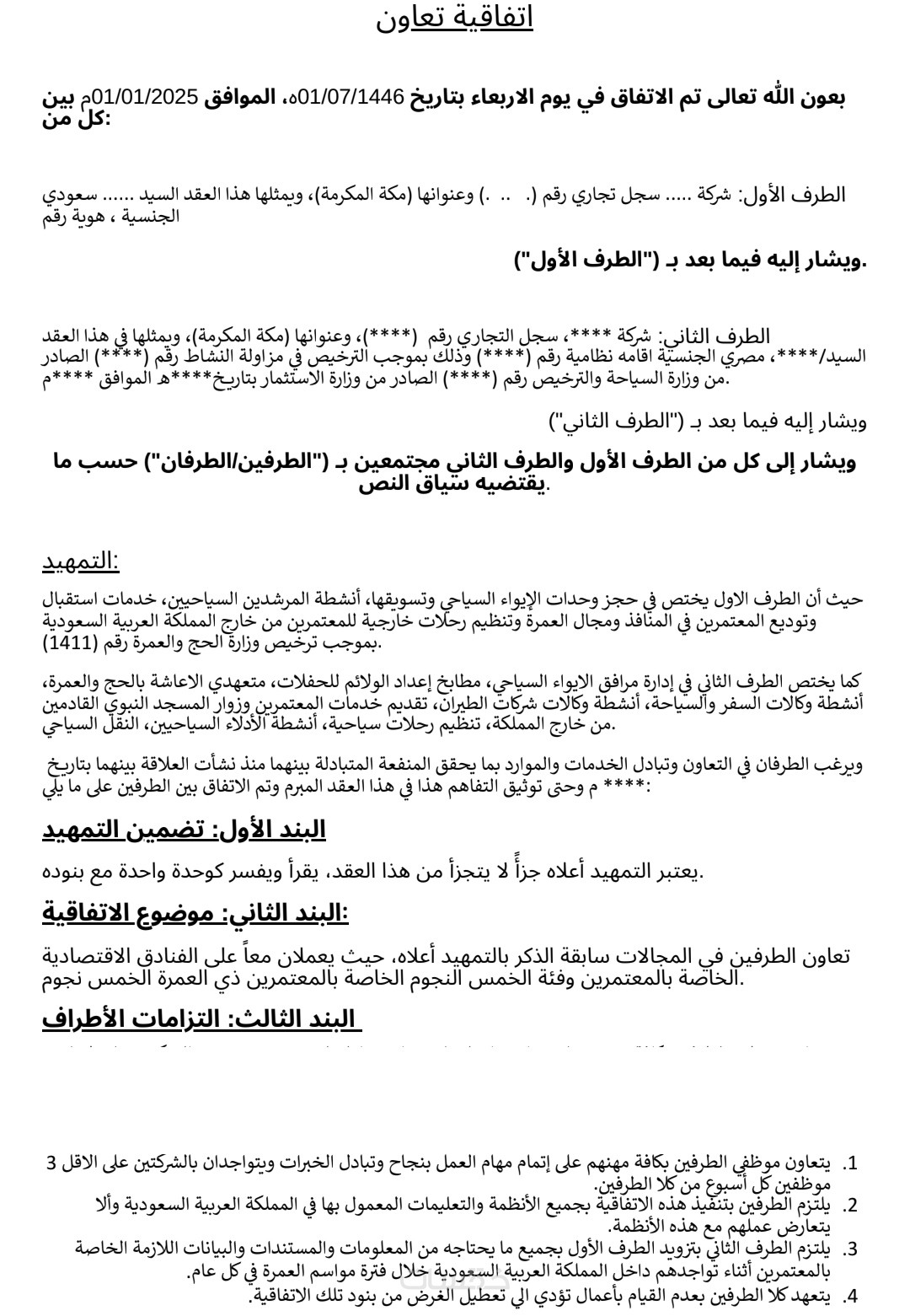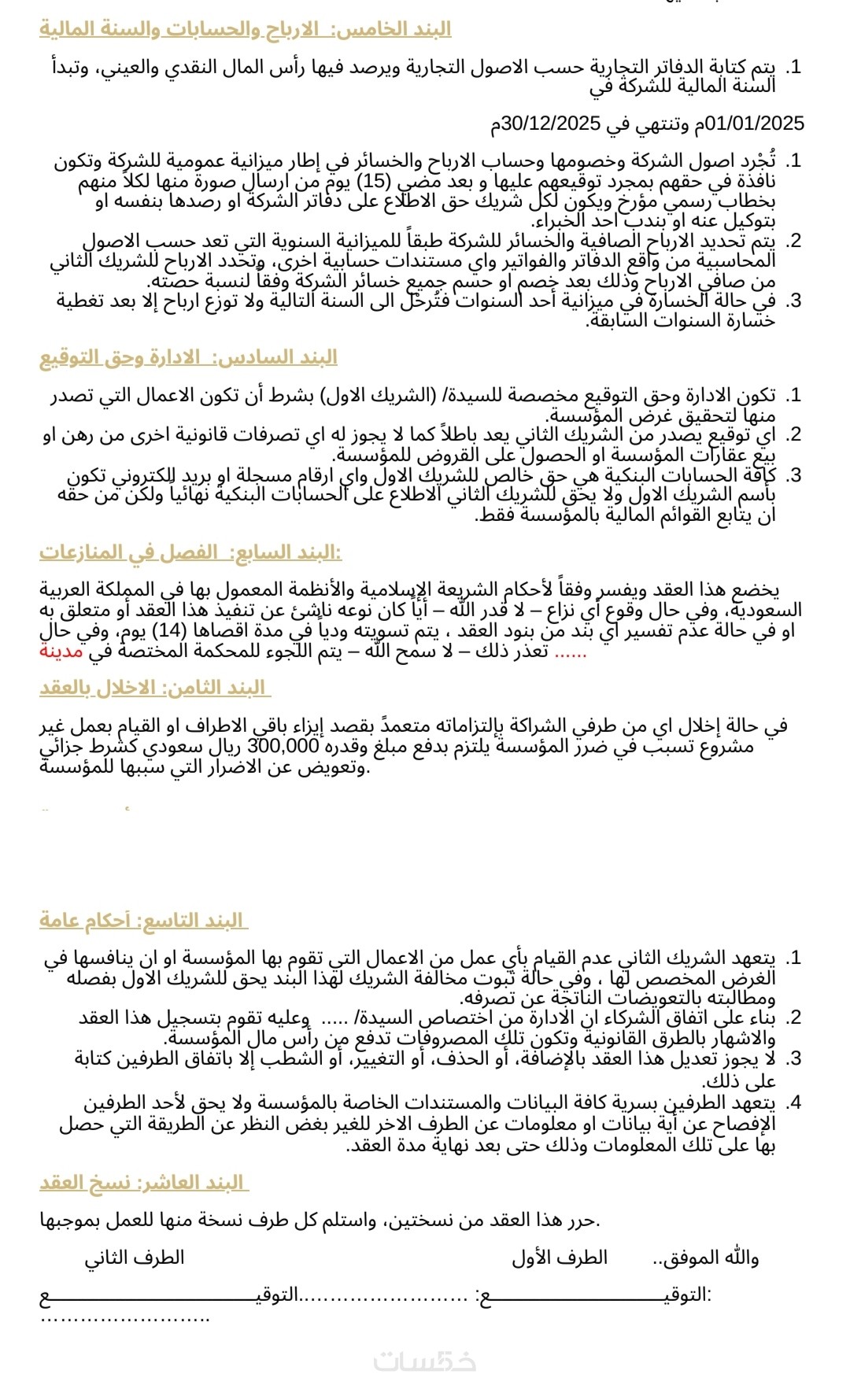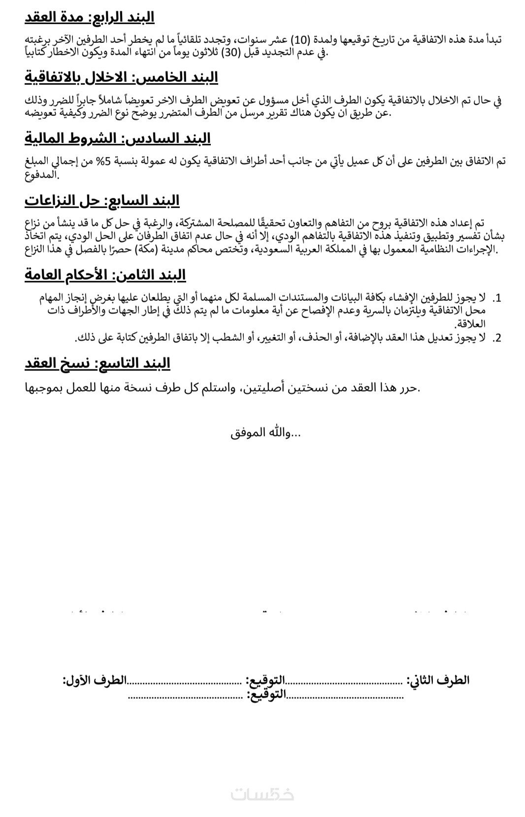 عقد مكون من ١٢ بند باللغه العربيه
