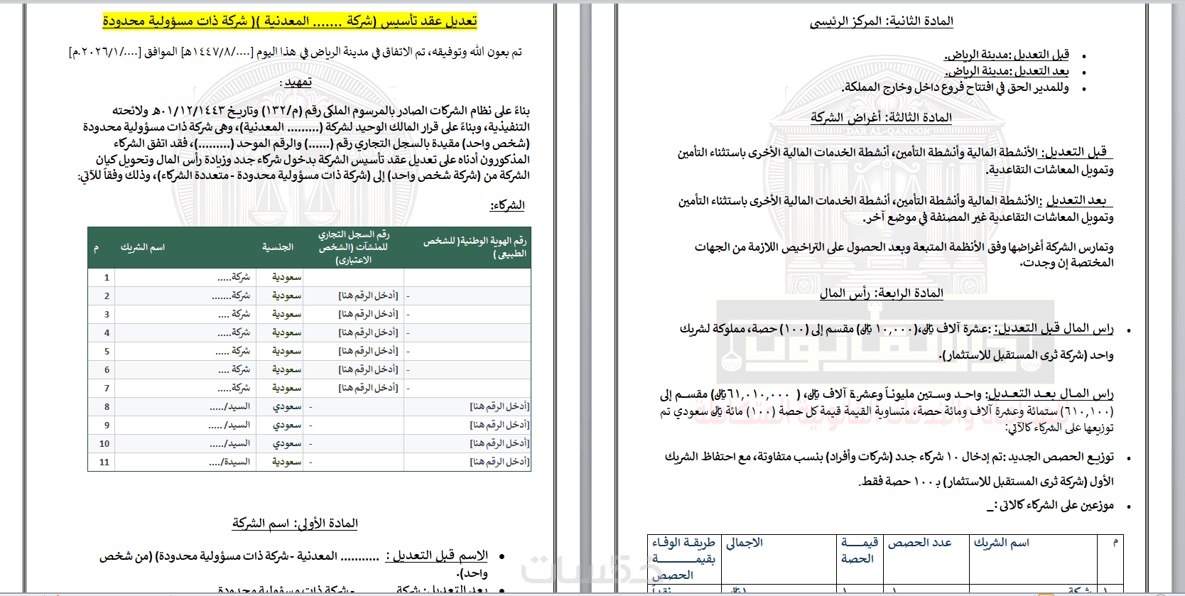 عقد تأسيس متكامل: نسخة احترافية من عقد التأسيس أو النظام الأساسي للشركة (سواء كانت ذ.م.م، مساهمة مبسطة، أو شركة شخص واحد) متوافقة مع الأنظمة السعودية والإماراتية.