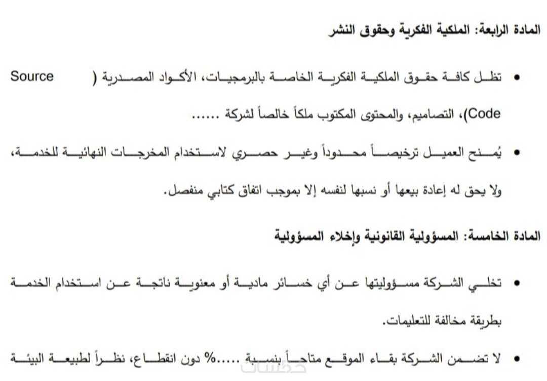 تحديد المسؤولية: إذا توقف الموقع فجأة بسبب عطل فني وتسبب بخسارة للمستخدم، تحميك هذه الشروط من دفع تعويضات ضخمة لأنك وضعت بنداً يخلي مسؤوليتك عن الأعطال التقنية الخارجة عن الإرادة.