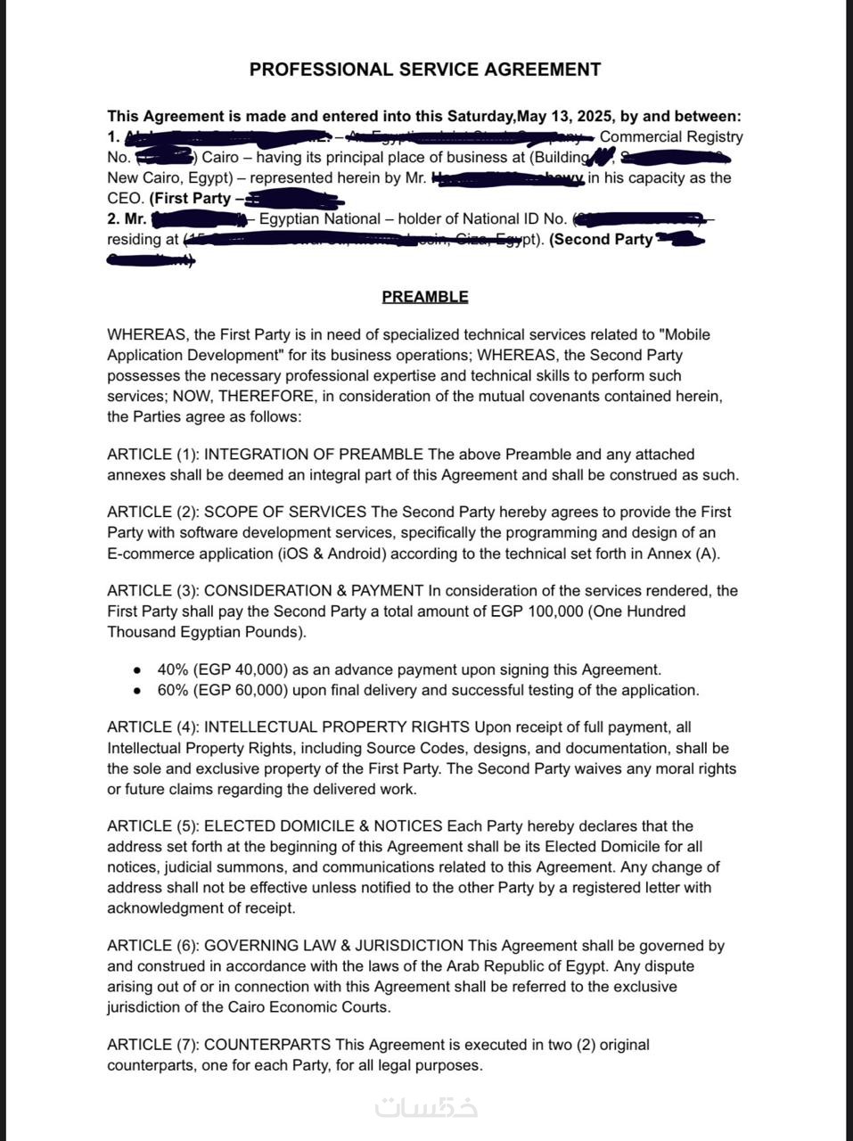 أنا أقدم لك خدمة صياغة ومراجعة العقود والاتفاقيات القانونية باللغة العربية بأسلوب احترافي دقيق، يضمن وضوح الالتزامات، وتقليل المخاطر، وحماية مصالحك القانونية بشكل كامل.