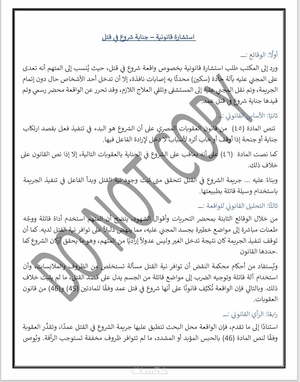 تقديم النصيحة القانونية مصاغة بأسلوب واضح يفهمه المتلقي غير المختص وتوجيهه بشأن القوانين المعمول بها وتحديد التزاماته وحقوقه وتوضيح الإجراءات اللازمة والمسارات القانونية المتاحة للحفاظ على حقوقه والتعامل مع المشكلة القانونية.