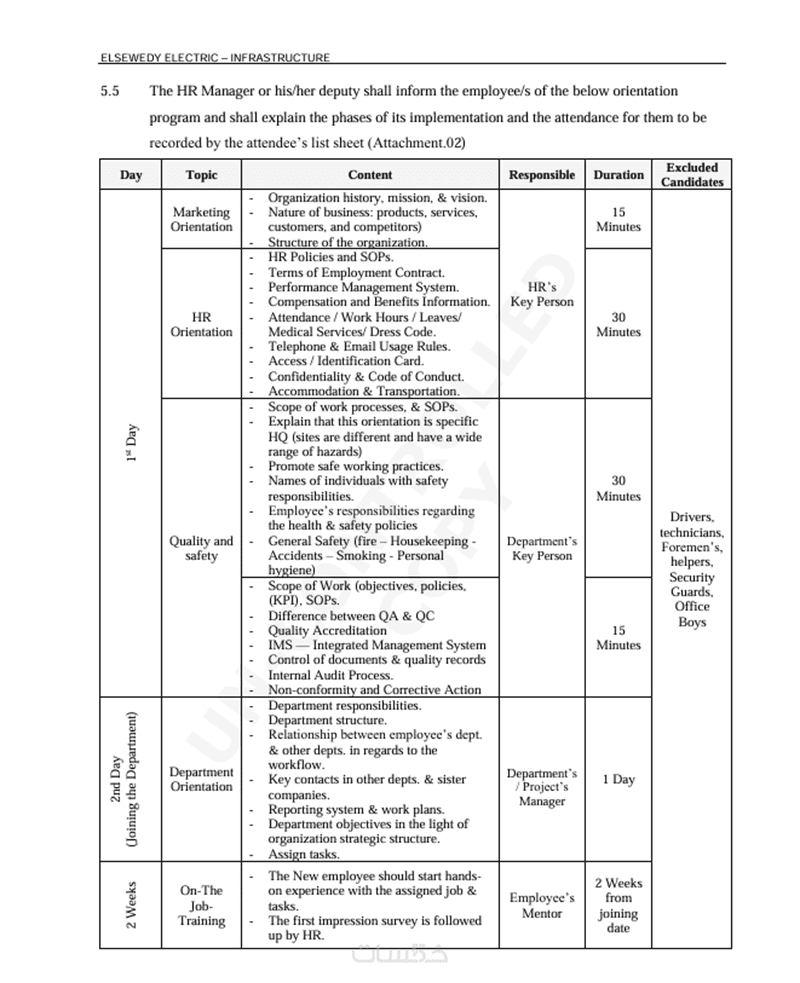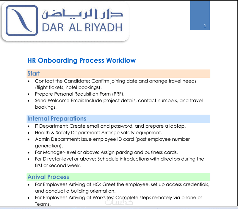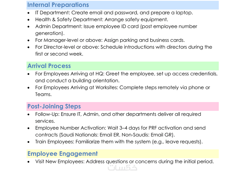 ( تشمل إجراءات Onboarding للموظف ومسئولية كل فرد داخل الموارد البشرية حتى إستلام الموظف للعمل وأدواته )