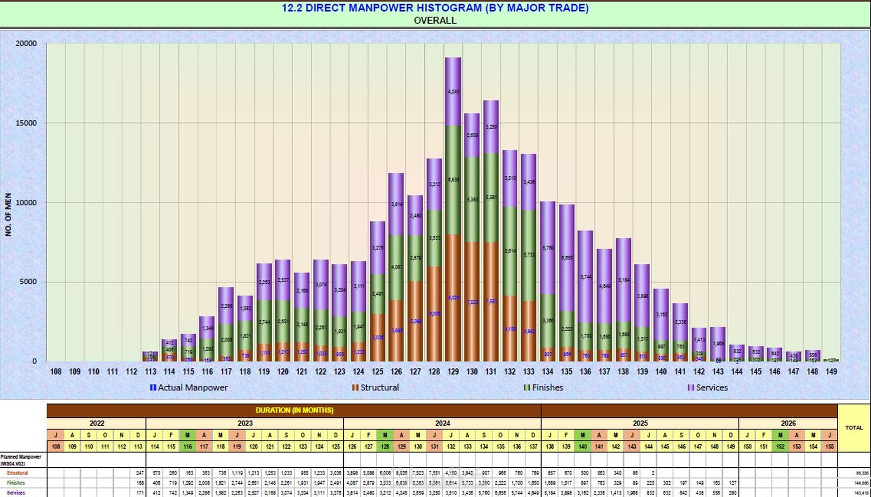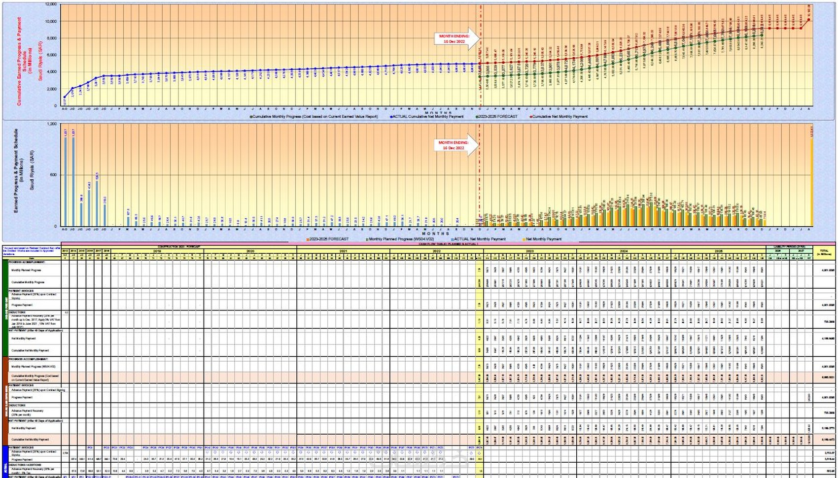 و ايضاً يتم اعداد الرسوم البيانة الخاصة بالتدفق النقدي للمشروع و توزيع العمالة على مدى الخط الزمني للمشروع.