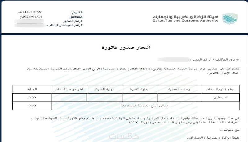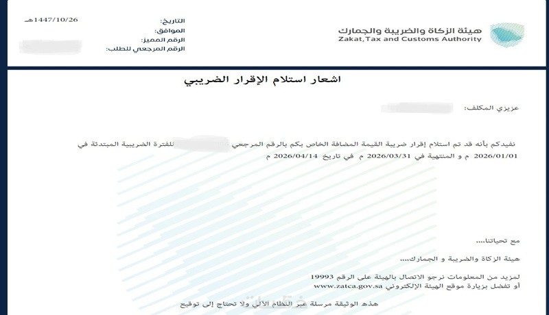 اشعار استلام الاقرار الضريبي و رقم السداد ان وجد