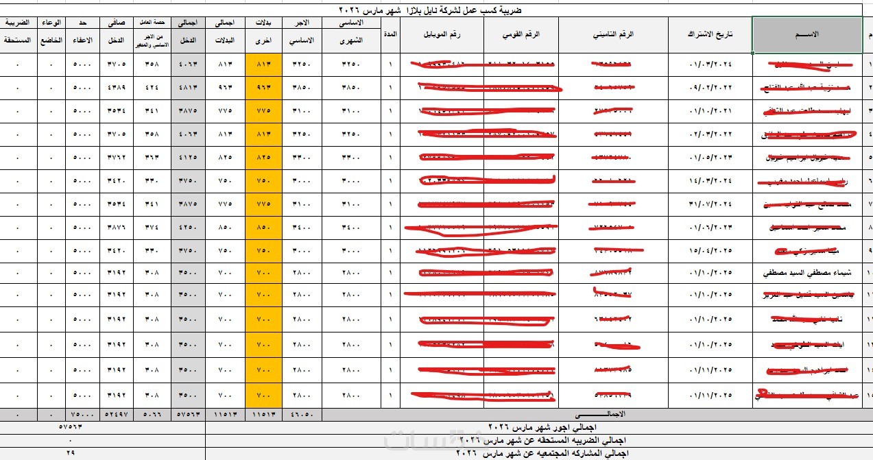 اعداد التحليل اللازم للموظفين شهريا حتي اعداد الضريبة المستحقة عنهم الخدمة مقابل عدد 5 موظفين